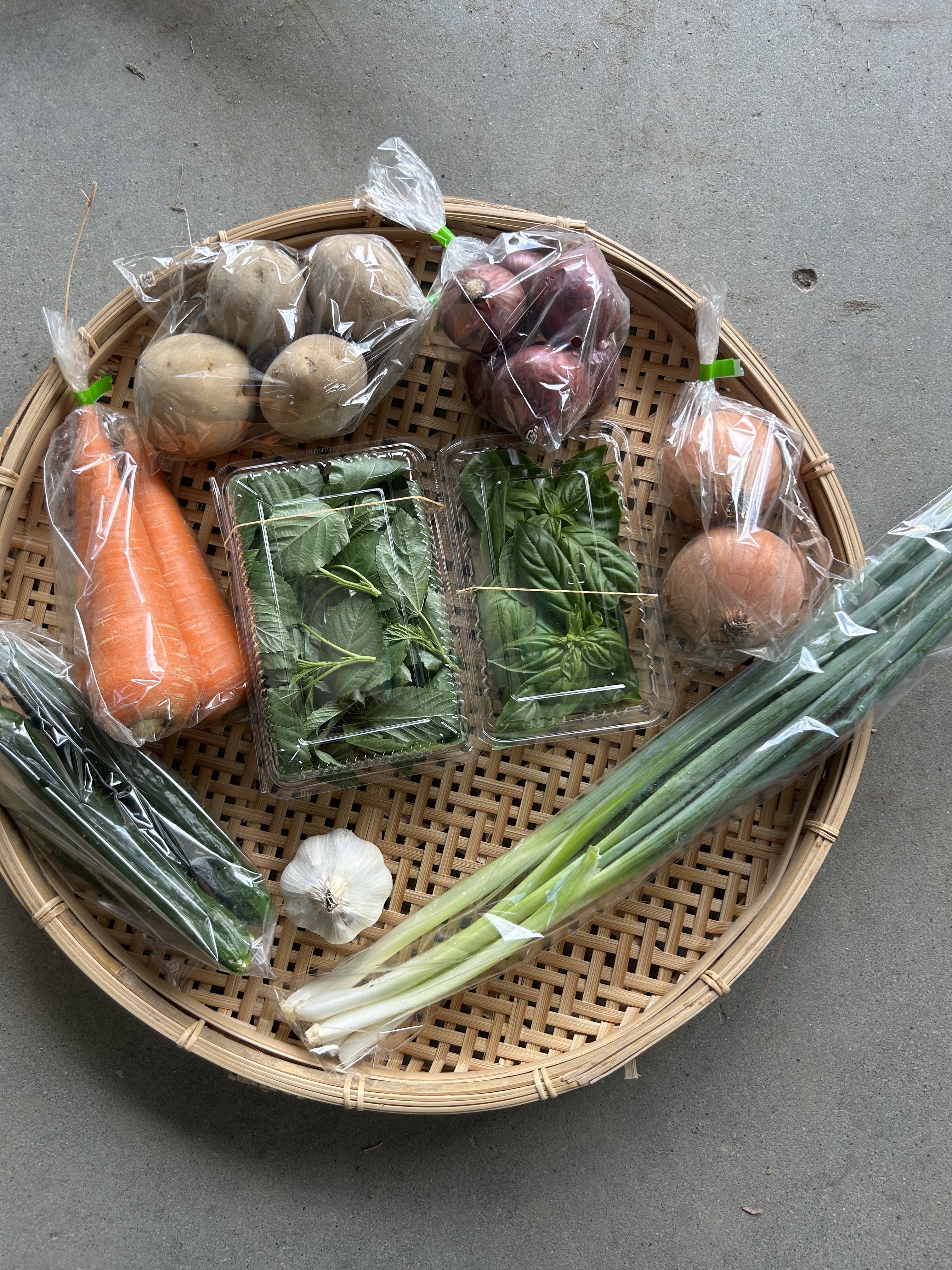 バジル、モロヘイヤ、人参、きゅうり、ネギ、ニンニク、赤玉ねぎ、玉ねぎ、じゃがいも(きたあかり)