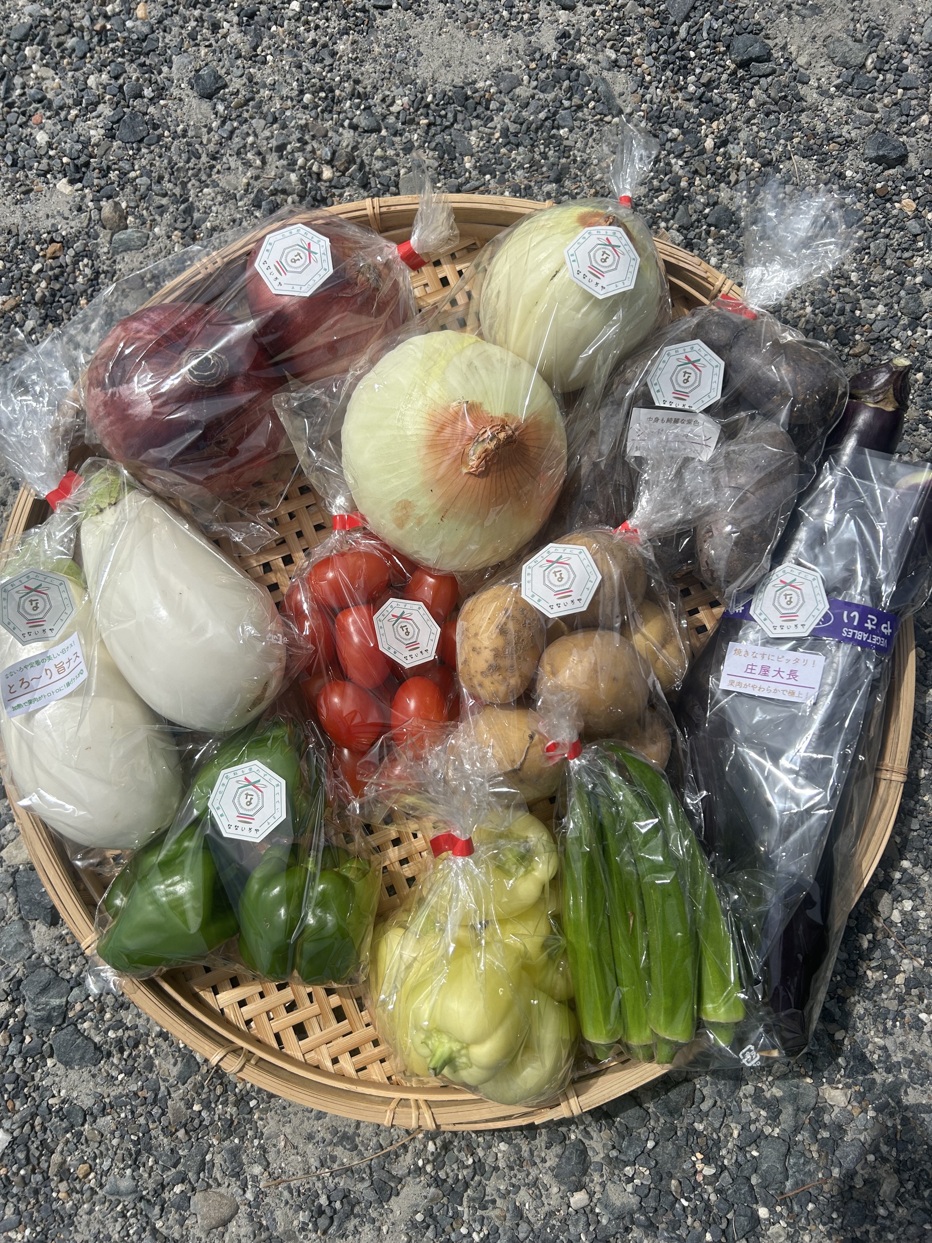 オクラ、クリームピーマン、ピーマン、とろーり旨ナス、庄屋大長ナス、赤玉ねぎ、新玉ねぎ、じゃがいも(シャドークイーン)、じゃがいも(とうや)、アイコミニトマト
