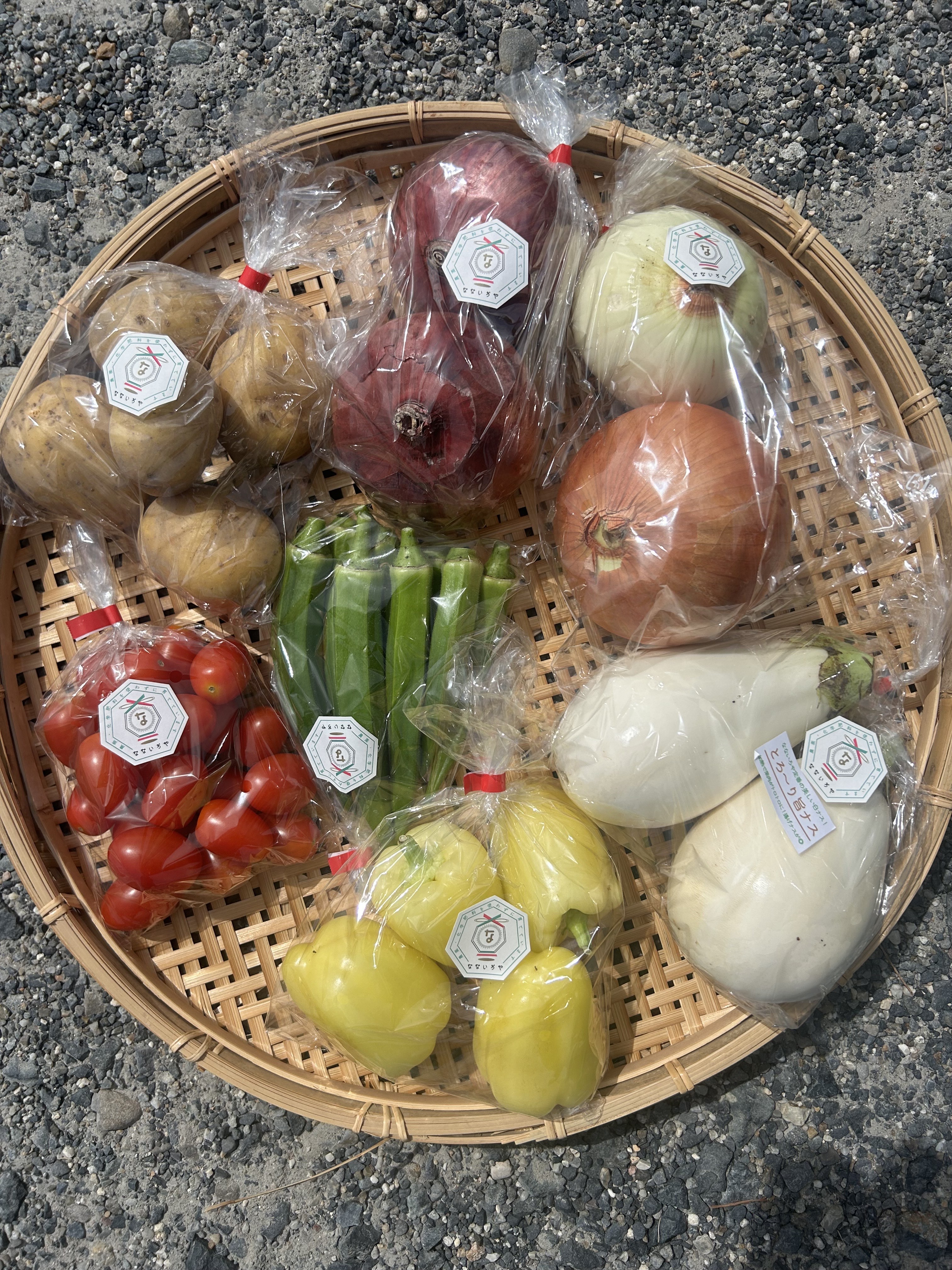 オクラ、クリームピーマン、とろーり旨ナス、赤玉ねぎ、新玉ねぎ、じゃがいも(とうや)、アイコミニトマト