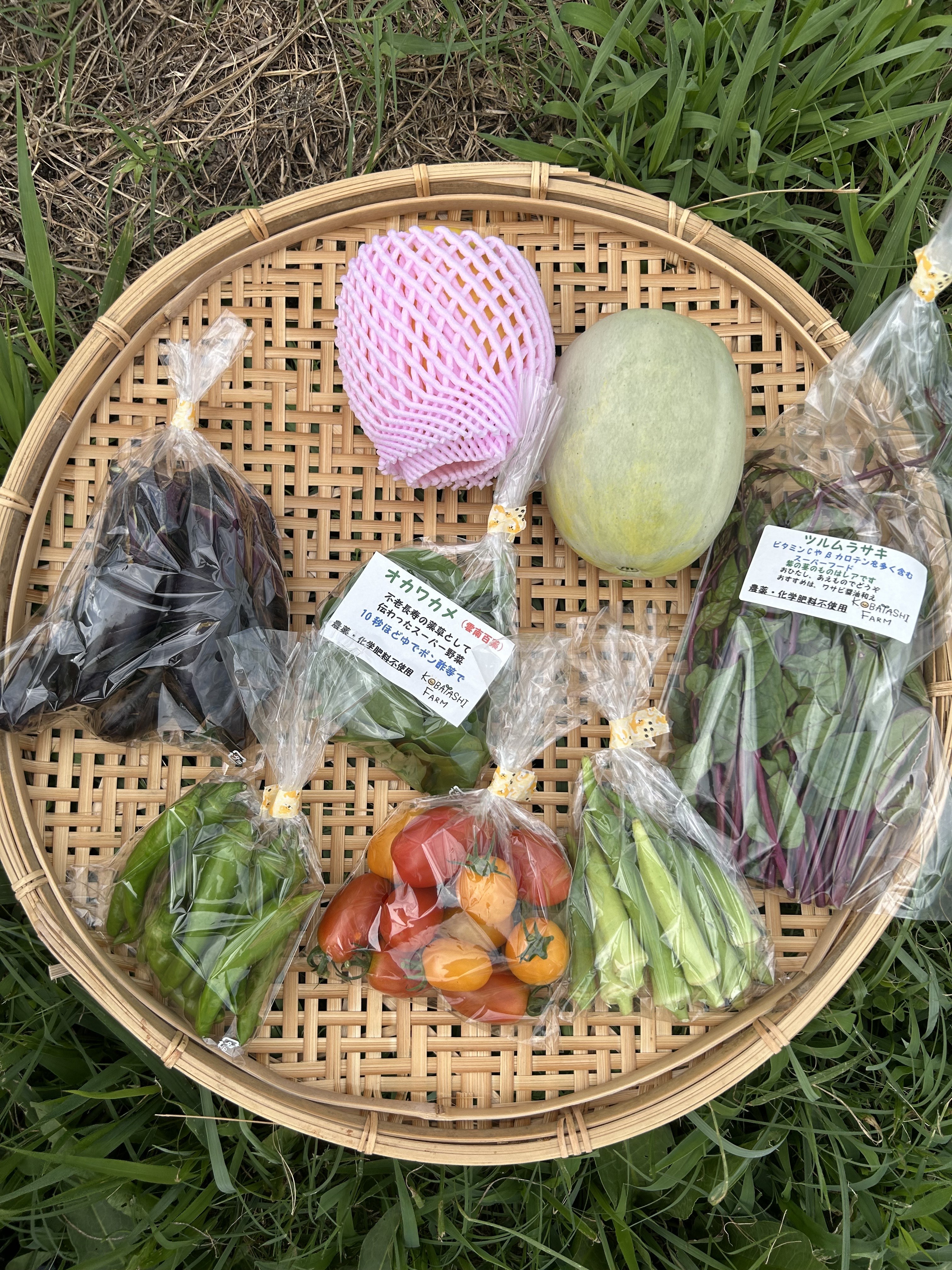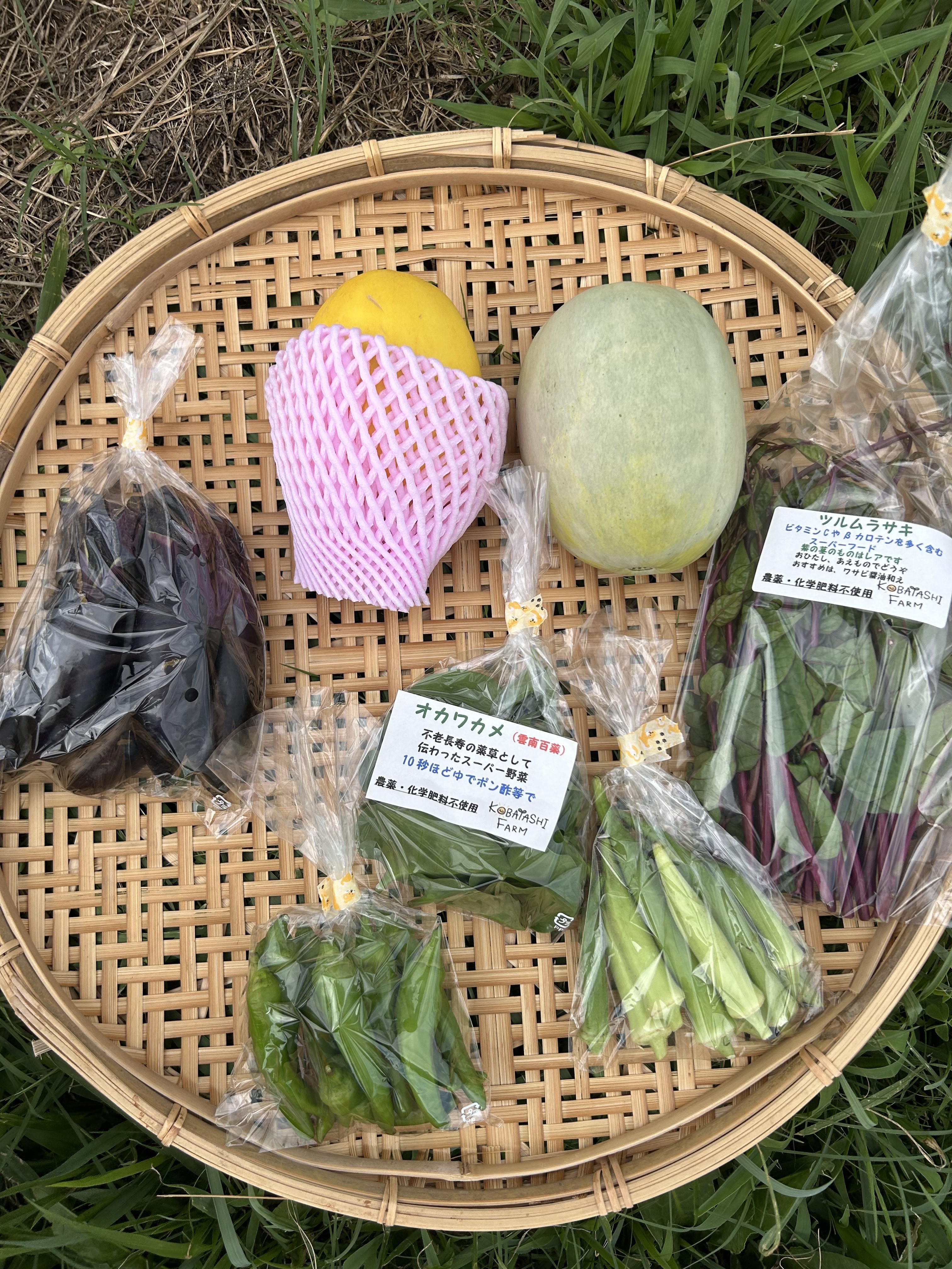 プリンスメロン、金太郎マクワ、ツルムラサキ、オカワカメ、甘唐辛子、長ナス、オクラ