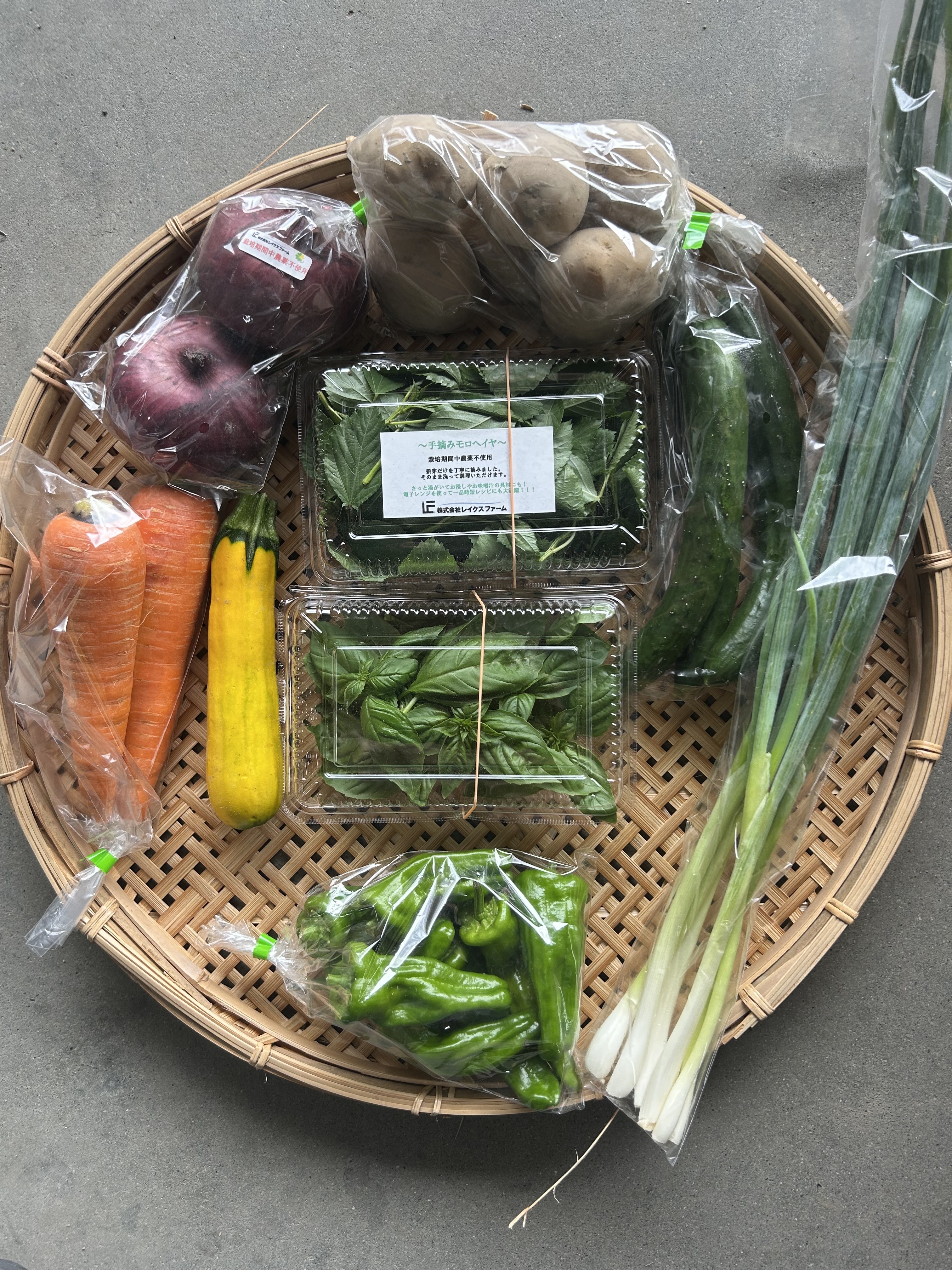 バジル、モロヘイヤ、人参、きゅうり、ズッキーニ、ピーマン、ネギ、赤玉ねぎ、じゃがいも(男爵)