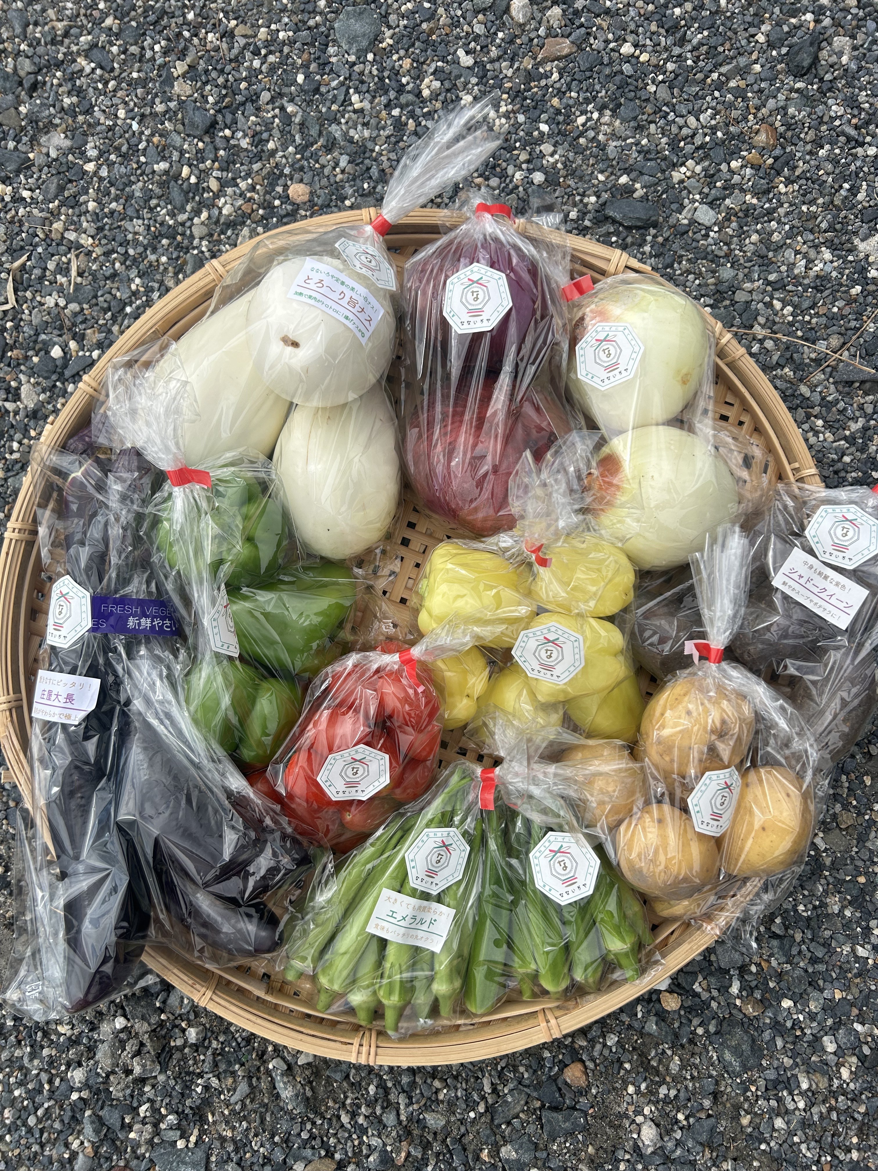 オクラ、クリームピーマン、ピーマン、とろーり旨ナス、庄屋大長ナス、赤玉ねぎ、新玉ねぎ、じゃがいも(シャドークイーン)、じゃがいも(とうや)、アイコミニトマト + 丸オクラ(エメラルド)