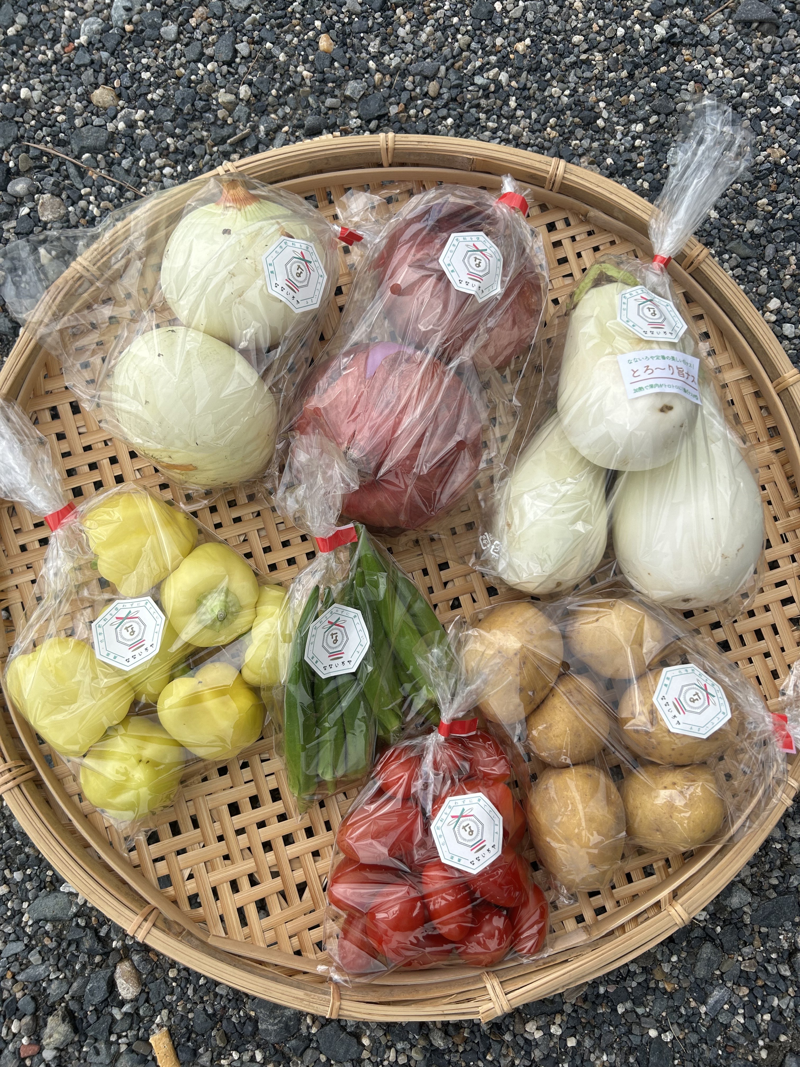 オクラ、クリームピーマン、とろーり旨ナス、赤玉ねぎ、新玉ねぎ、じゃがいも(とうや)、アイコミニトマト