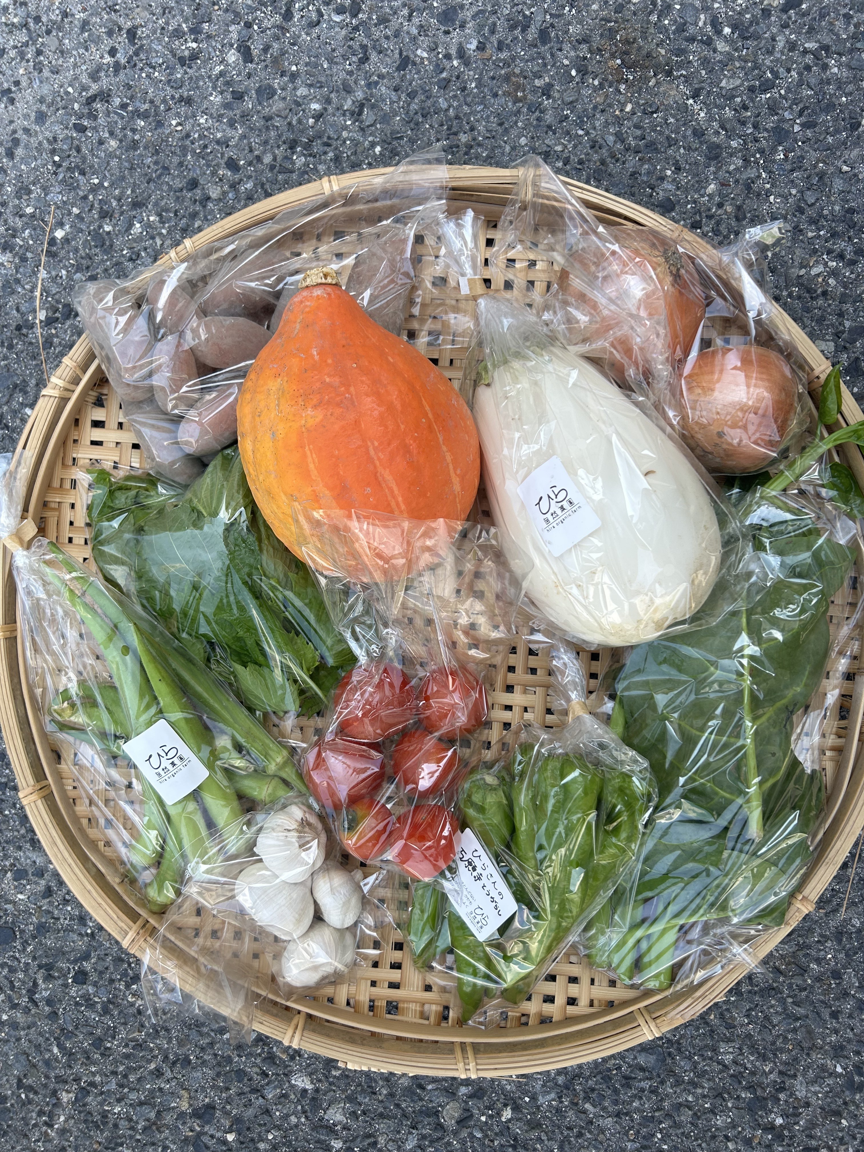 空芯菜、金太郎マクワ、ツルムラサキ、オカワカメ、甘唐辛子、長ナス、オクラミックス、バターナッツかぼちゃ ✙ プッチーニかぼちゃ