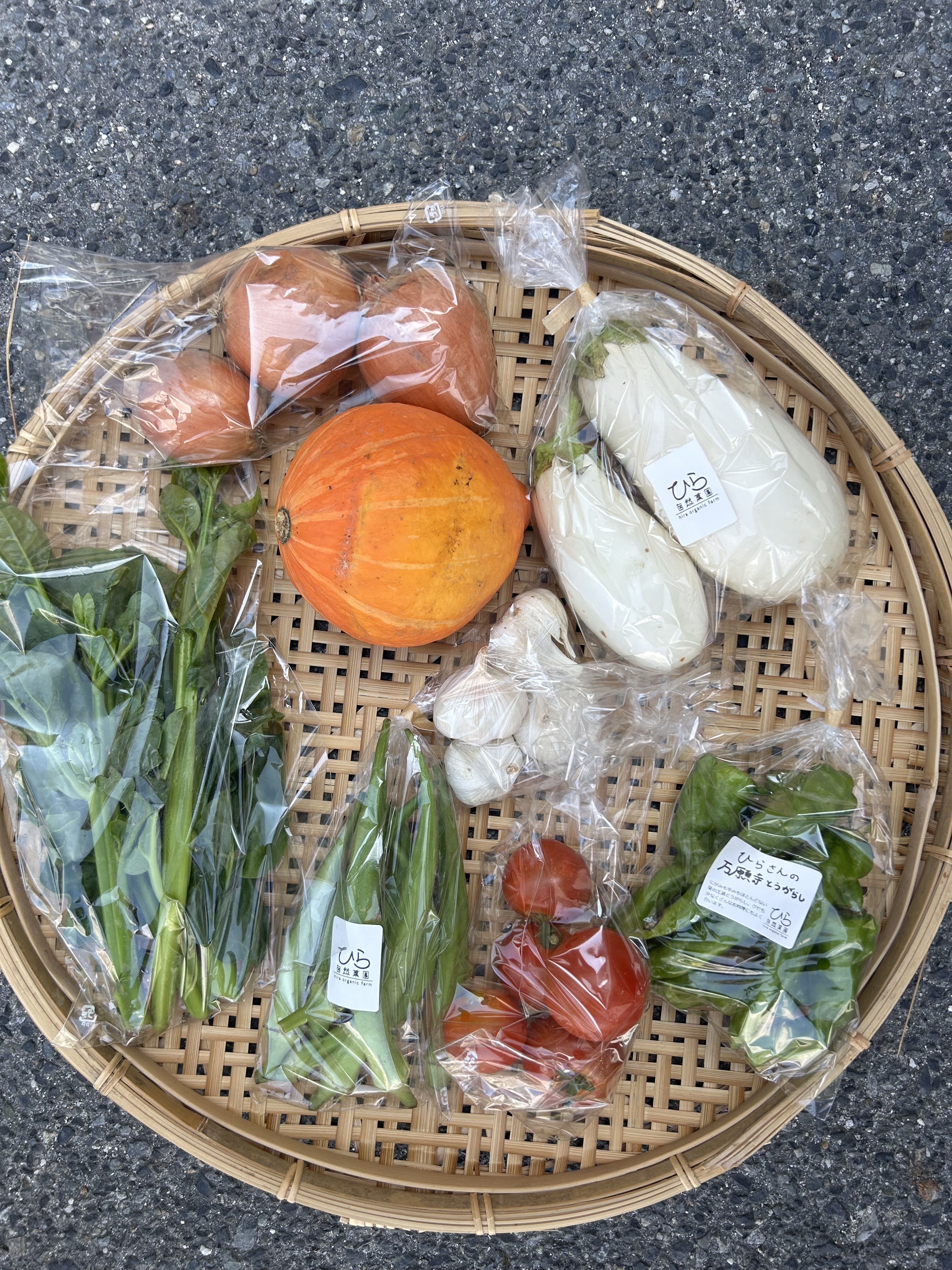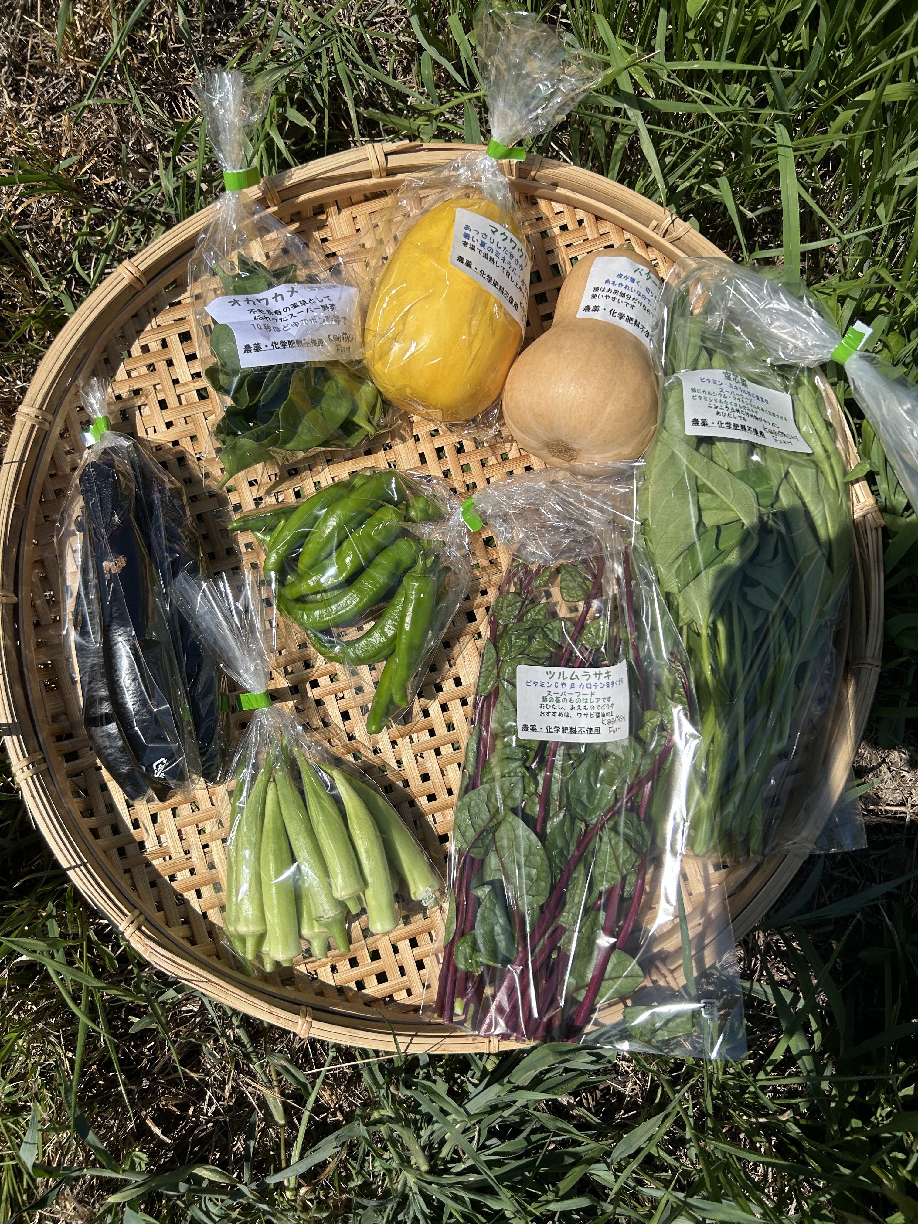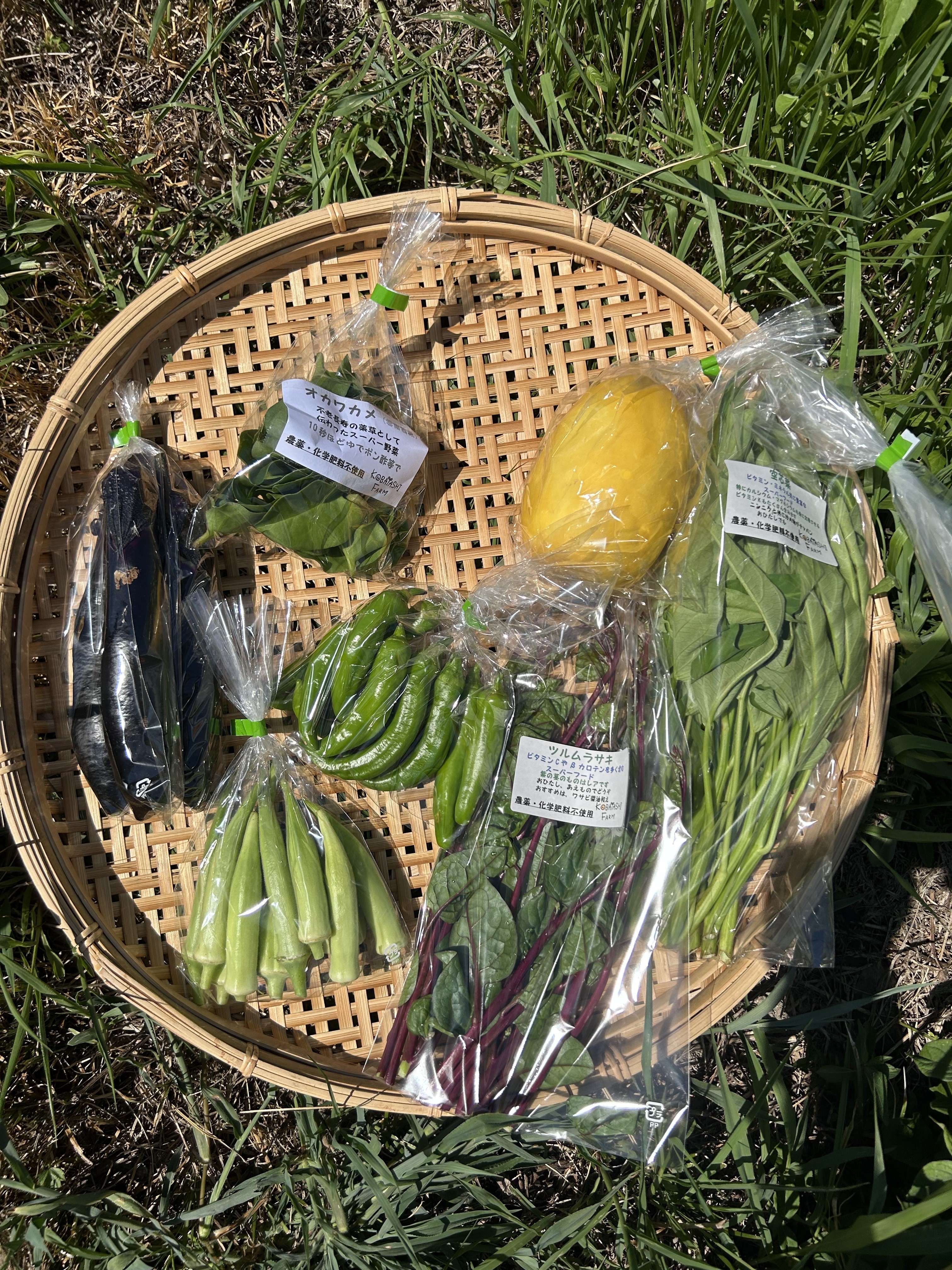 空芯菜、金太郎マクワ、ツルムラサキ、オカワカメ、甘唐辛子、長ナス、オクラミックス