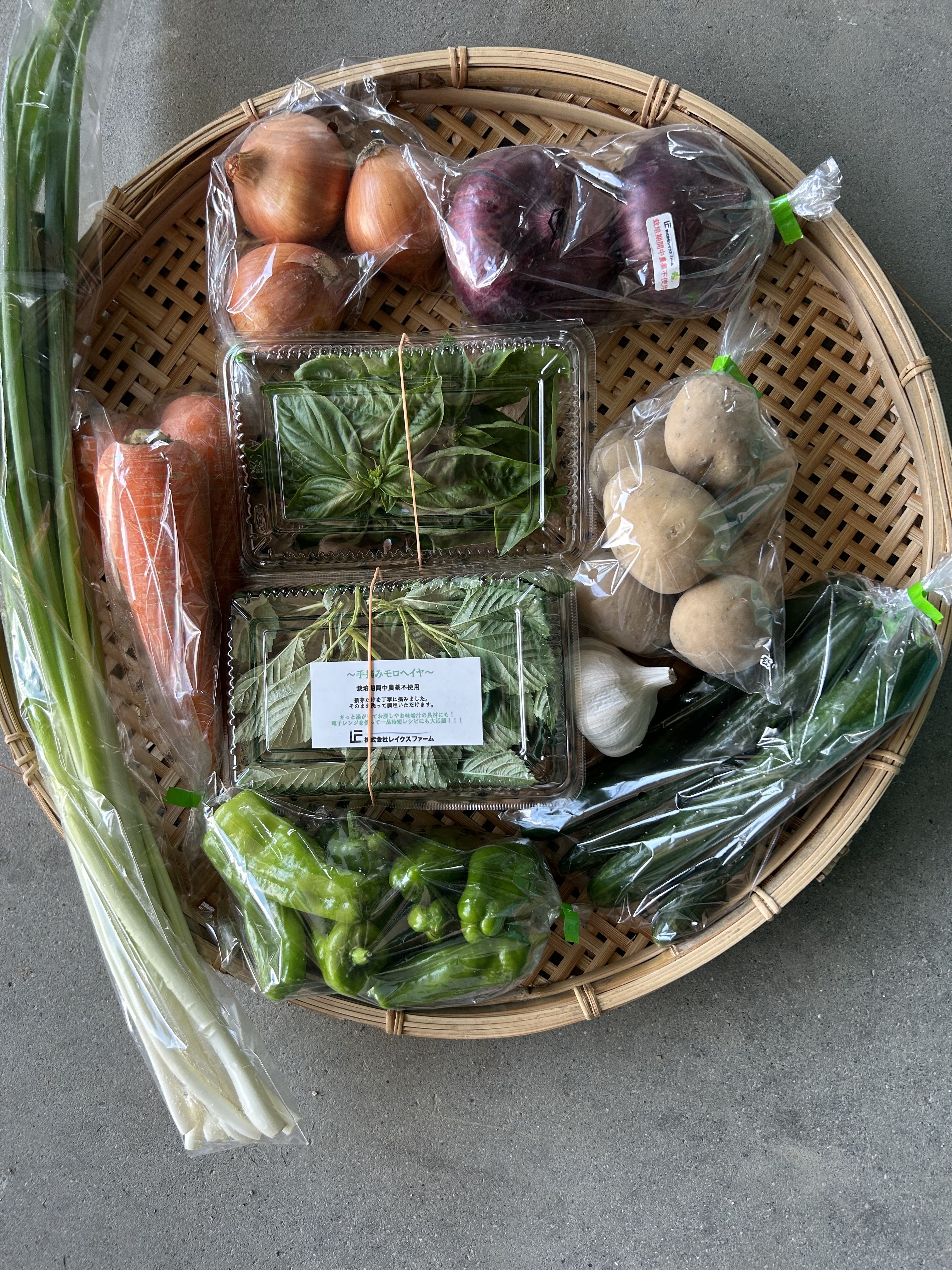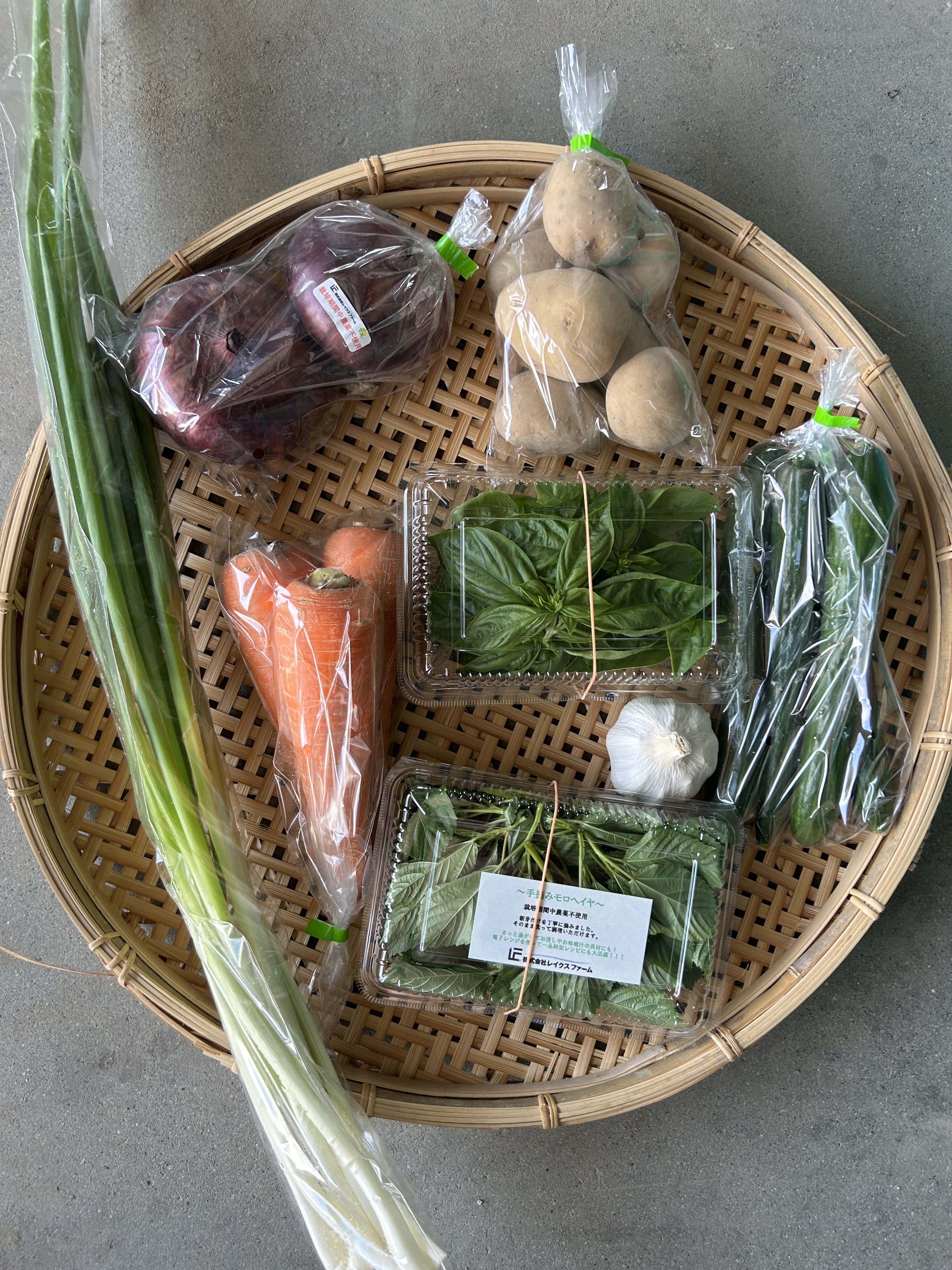 バジル、モロヘイヤ、人参、きゅうり、ネギ、ニンニク、赤玉ねぎ、じゃがいも(メークイン)