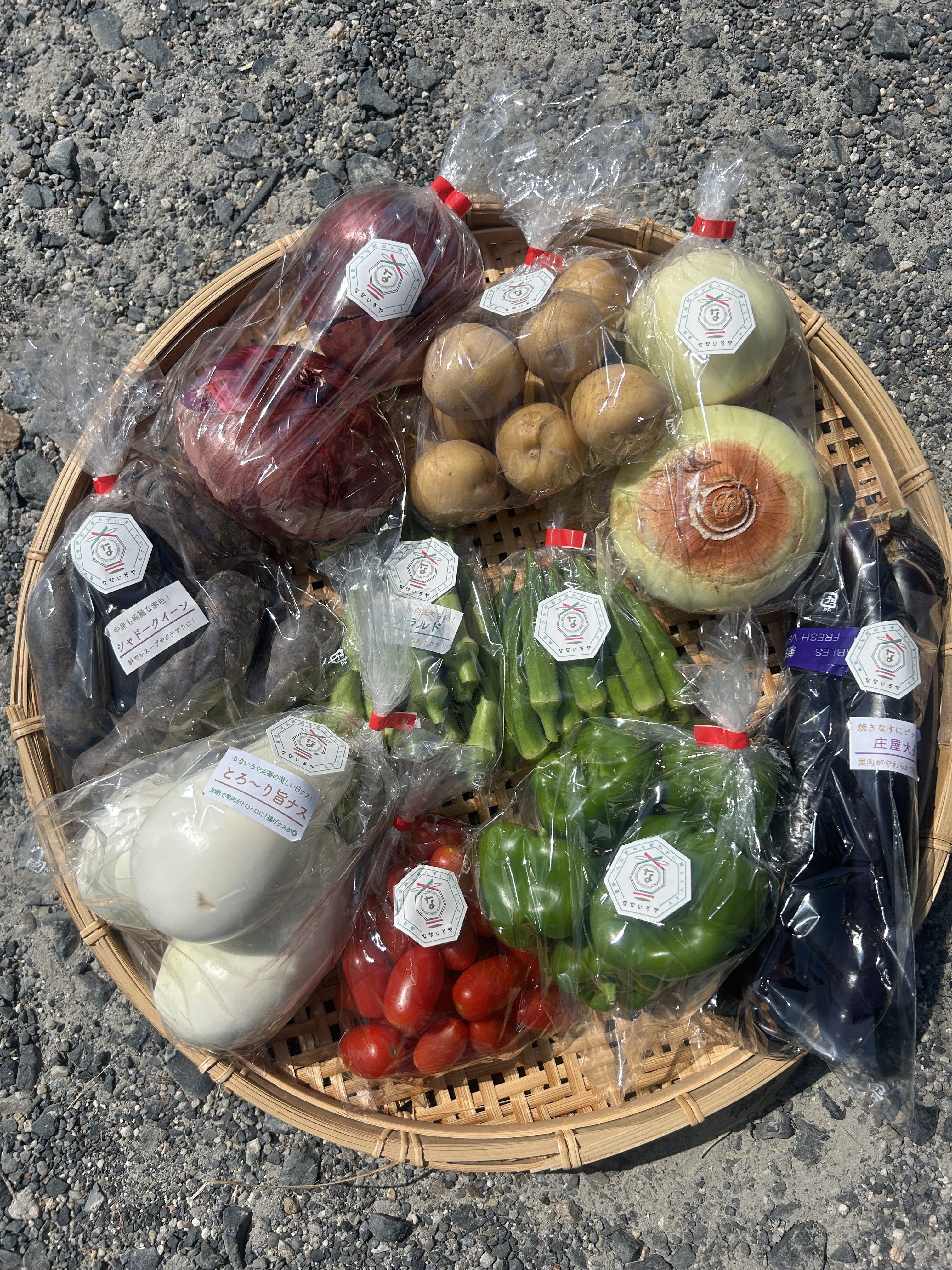 オクラ、丸オクラ(エメラルド)、ピーマン、とろーり旨ナス、庄屋大長ナス、赤玉ねぎ、新玉ねぎ、じゃがいも(とうや)、じゃがいも(シャドークイーン)、アイコミニトマト ✙ カラーピーマン