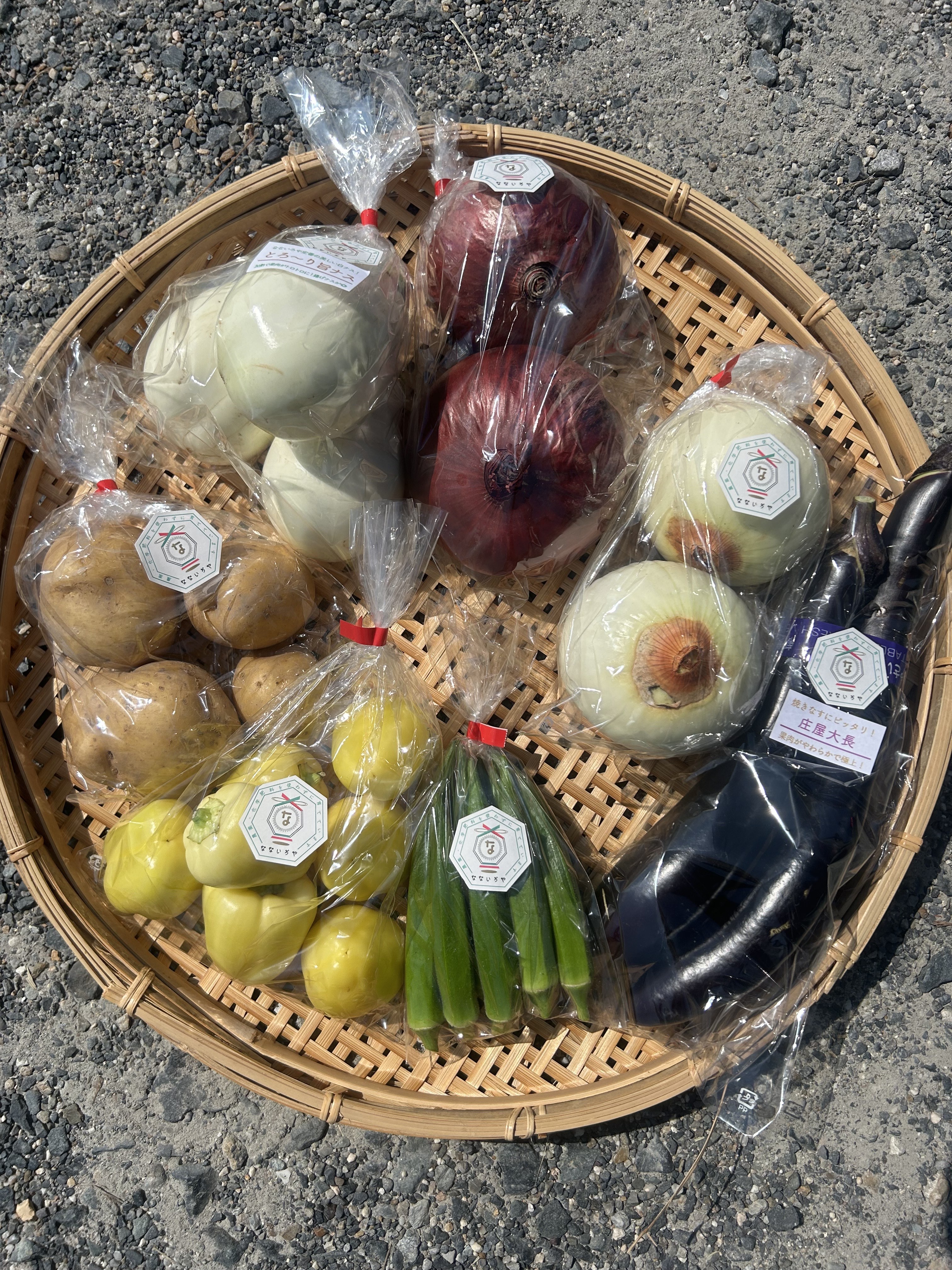 オクラ、クリームピーマン、とろーり旨ナス、庄屋大長ナス、赤玉ねぎ、新玉ねぎ、じゃがいも(とうや)