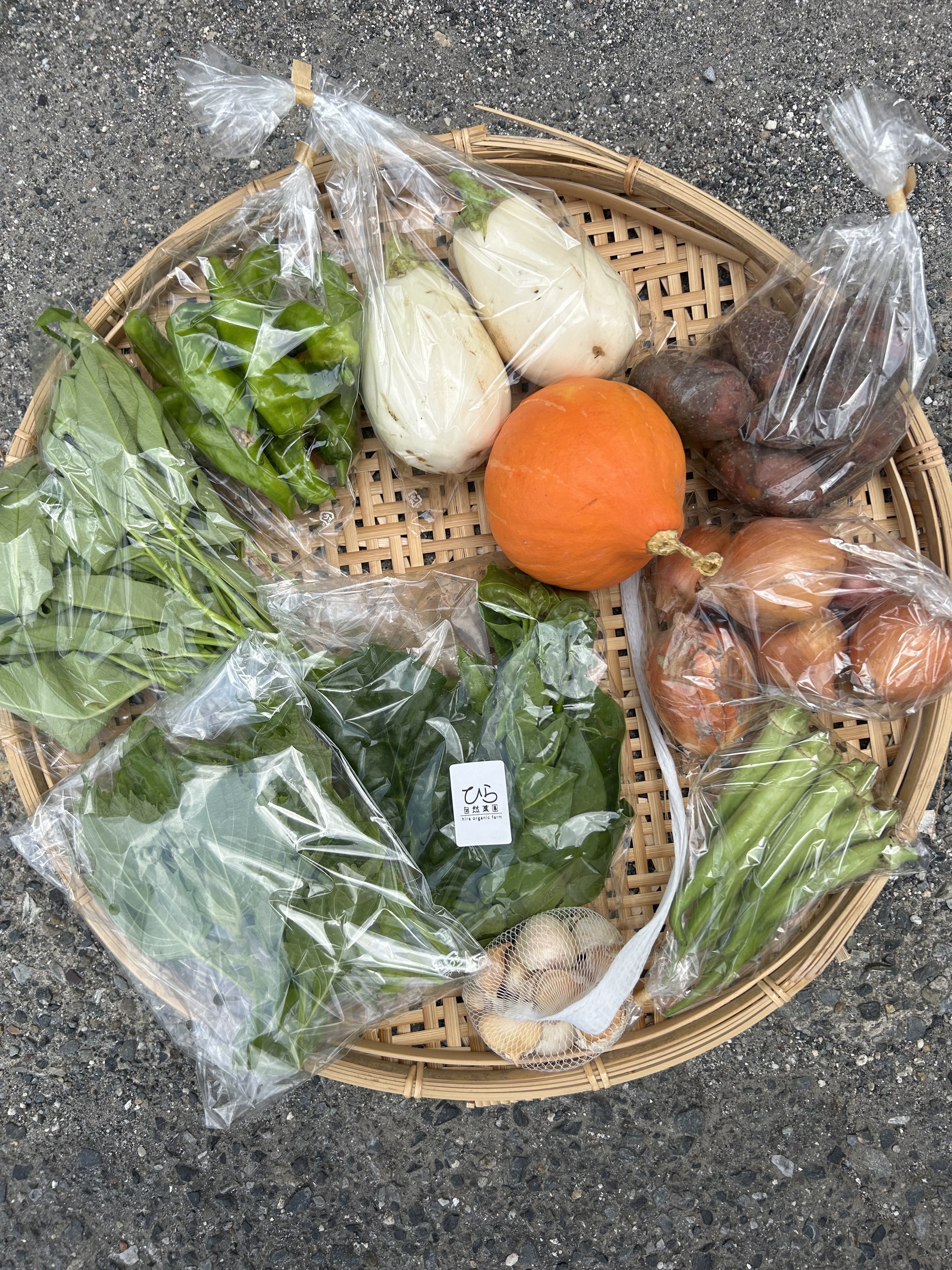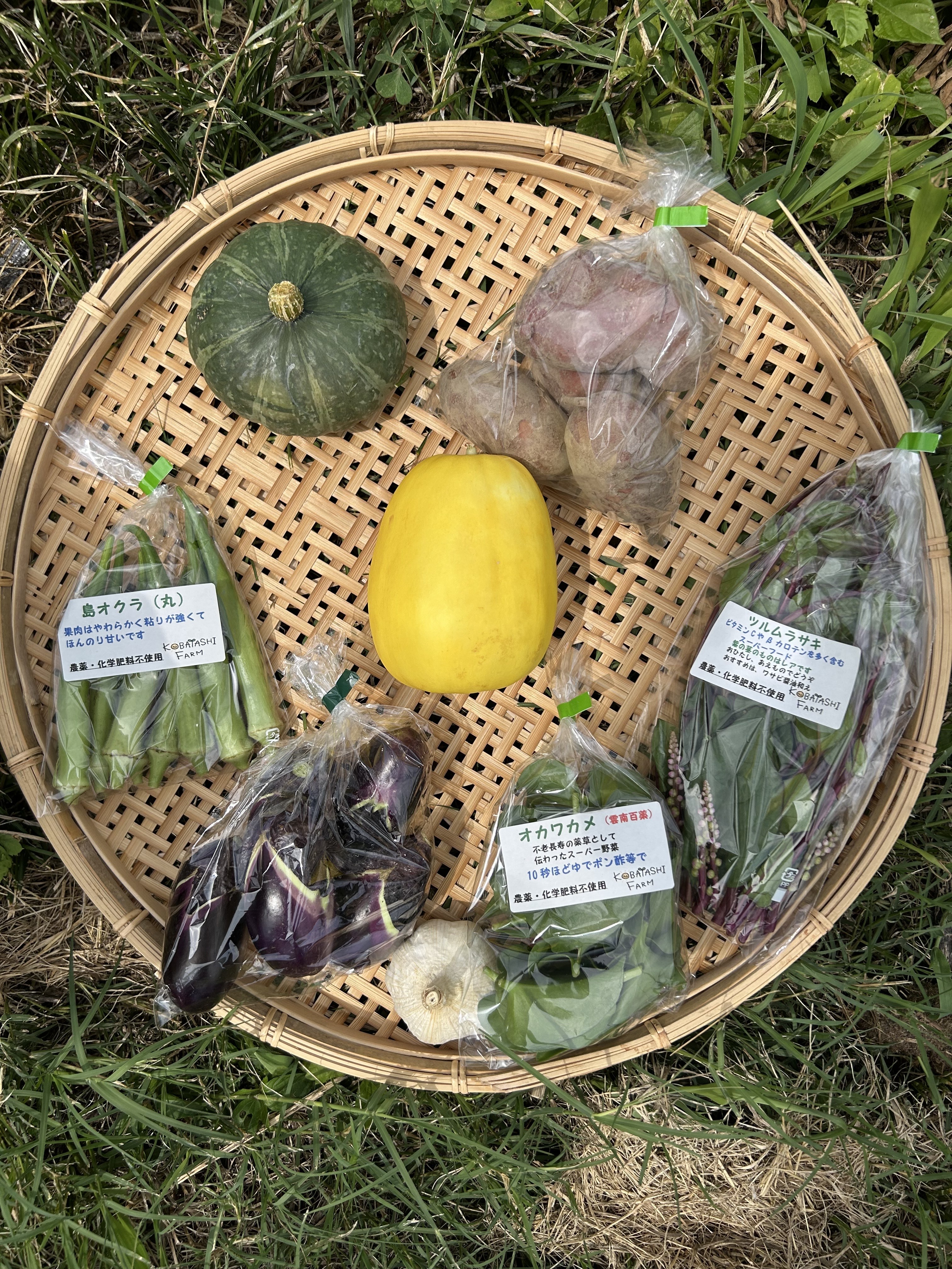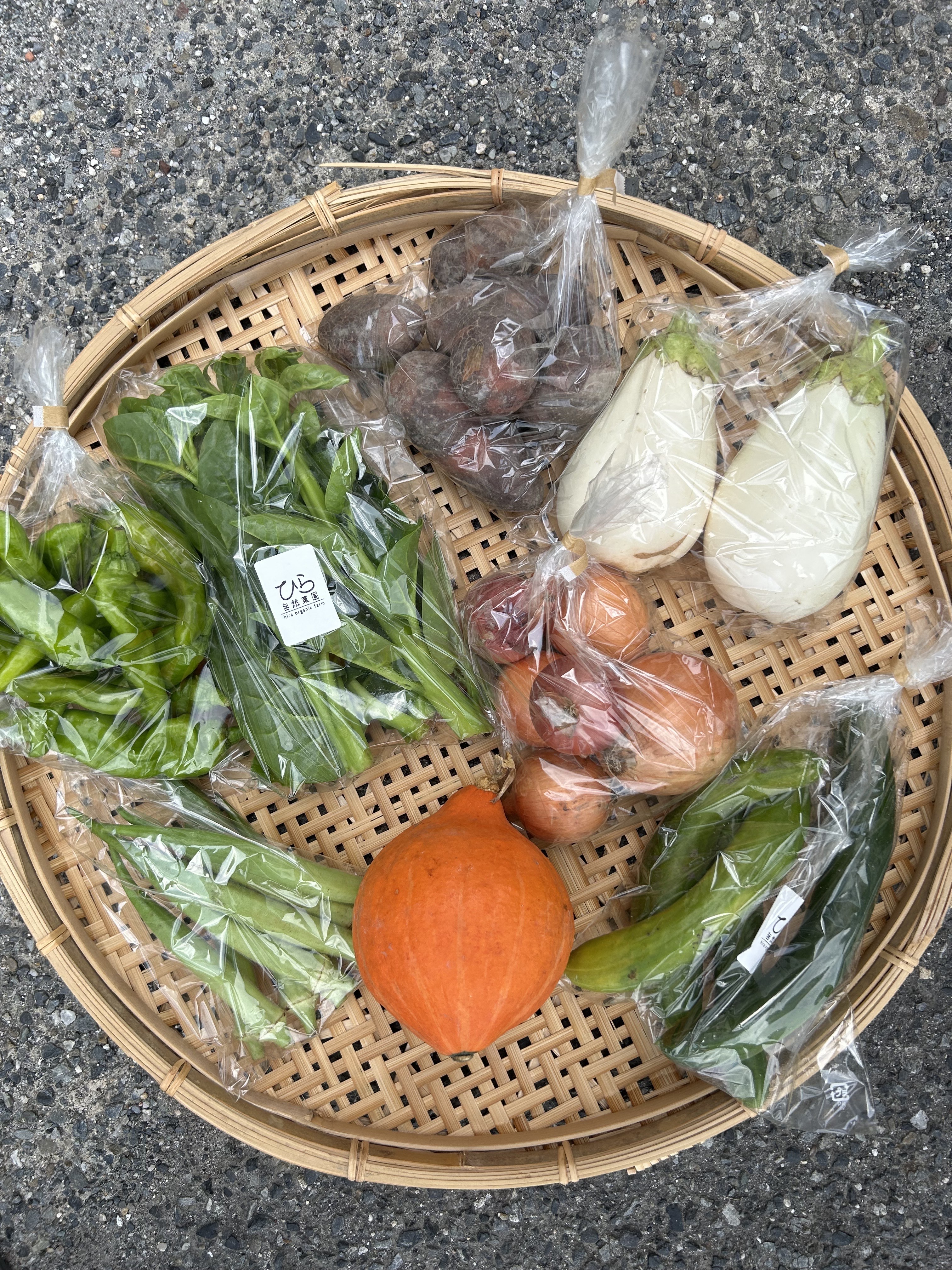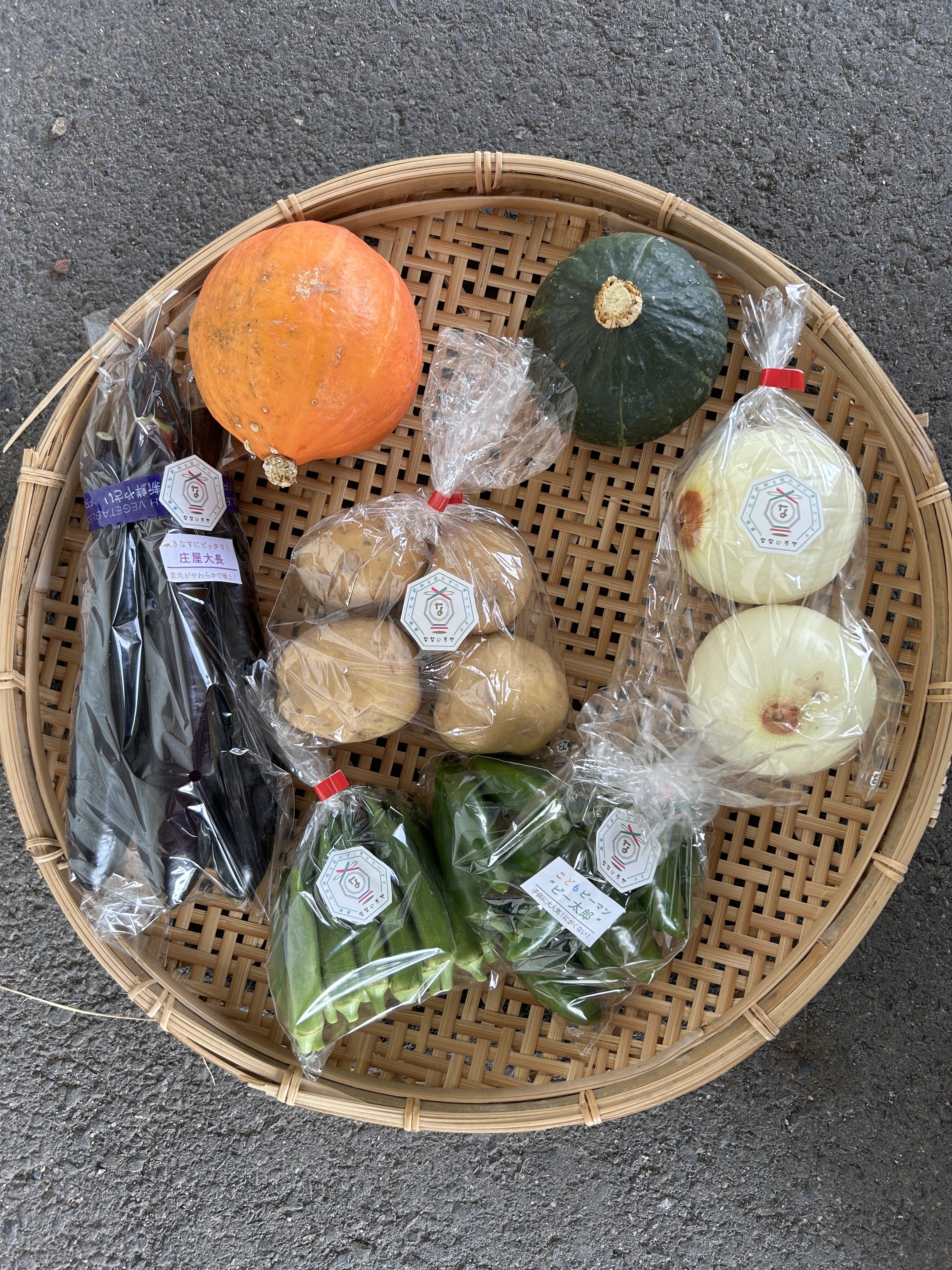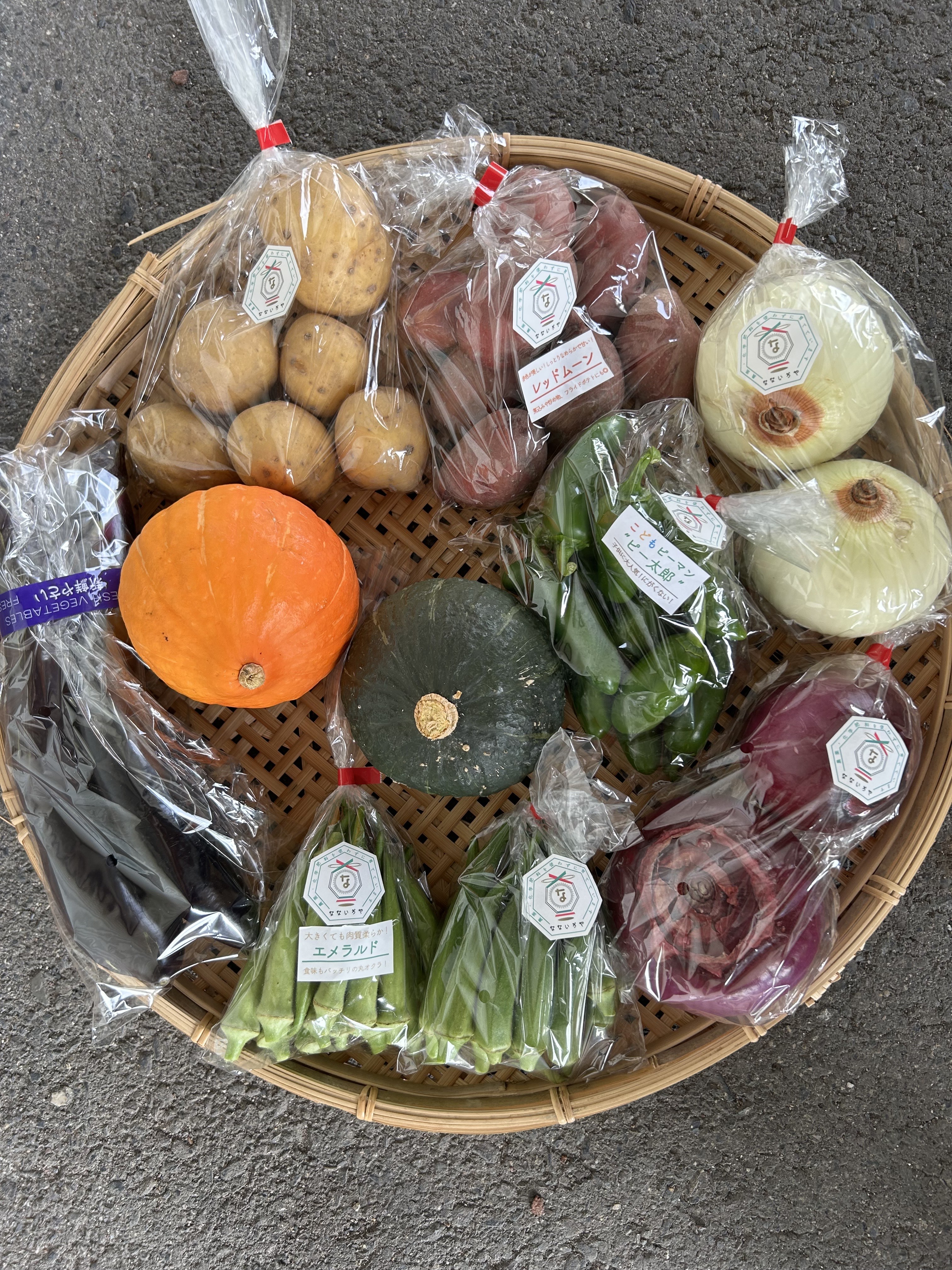 オクラ、丸オクラ(エメラルド)、ピー太郎、庄屋大長ナス、新玉ねぎ、じゃがいも(とうや)、コリンキー、ミニかぼちゃ、赤玉ねぎ、レッドムーン ✙ カラーピーマン(写真に入っていません)