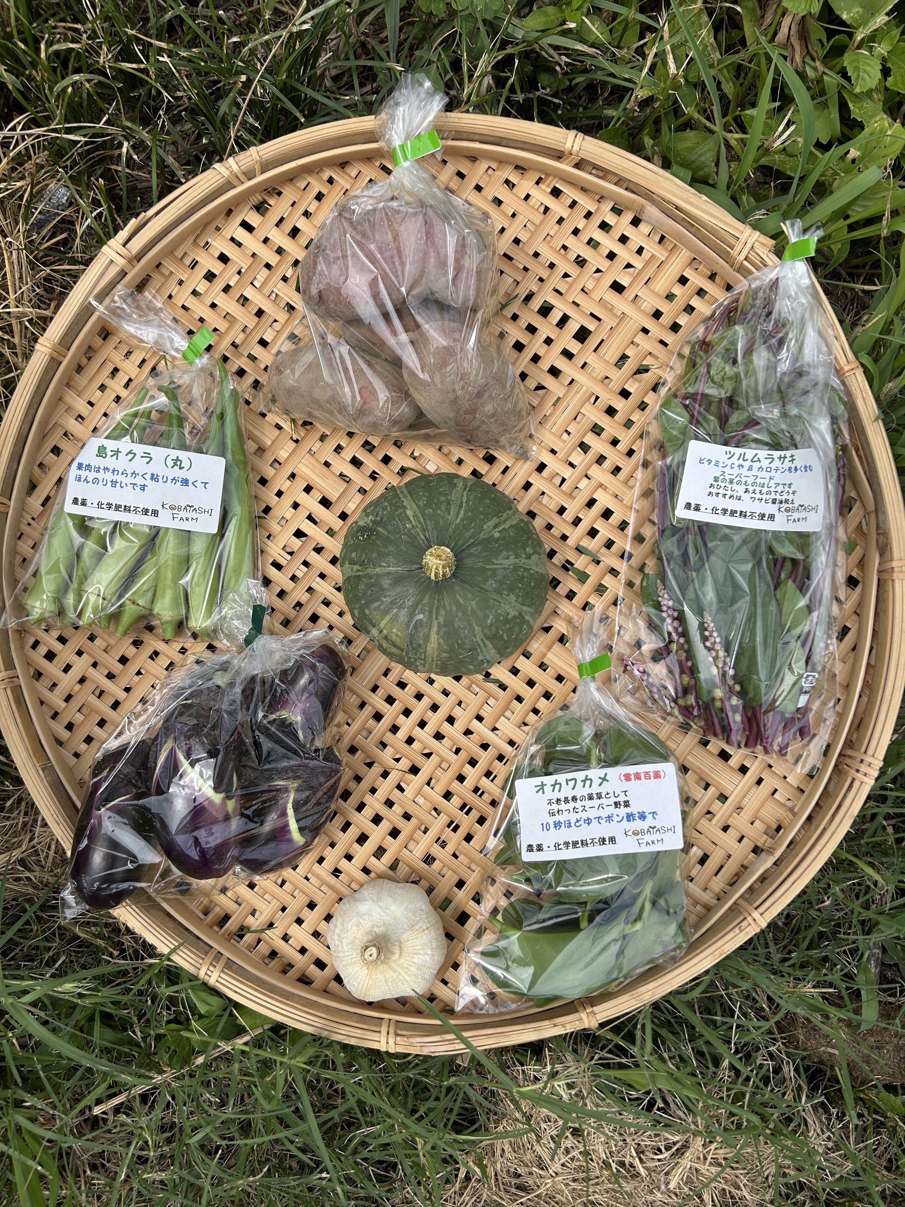 オカワカメ、ツルムラサキ、しまオクラ、ミニかぼちゃ、下田ナス、じゃがいも(レッドムーン)、ニンニク