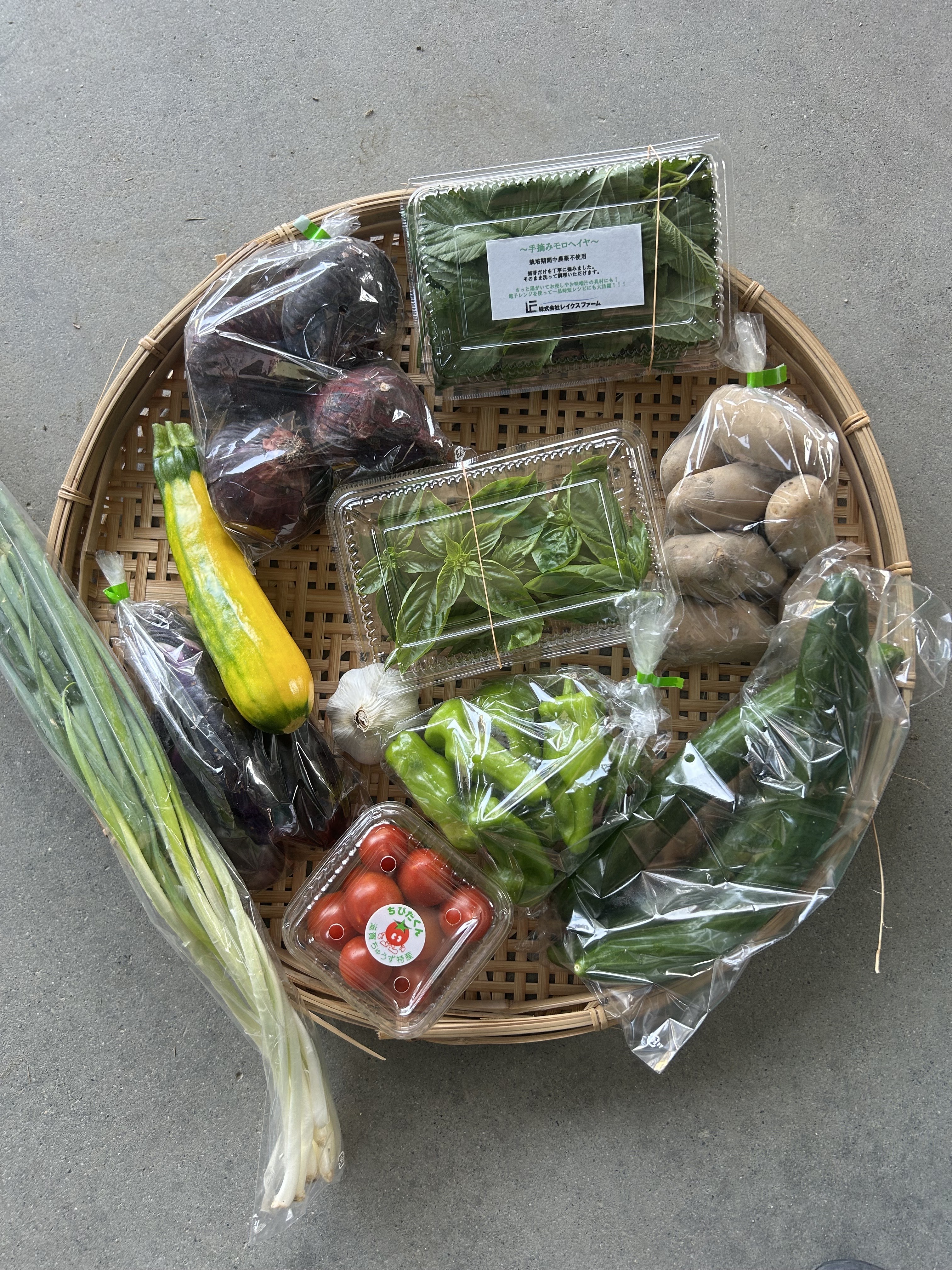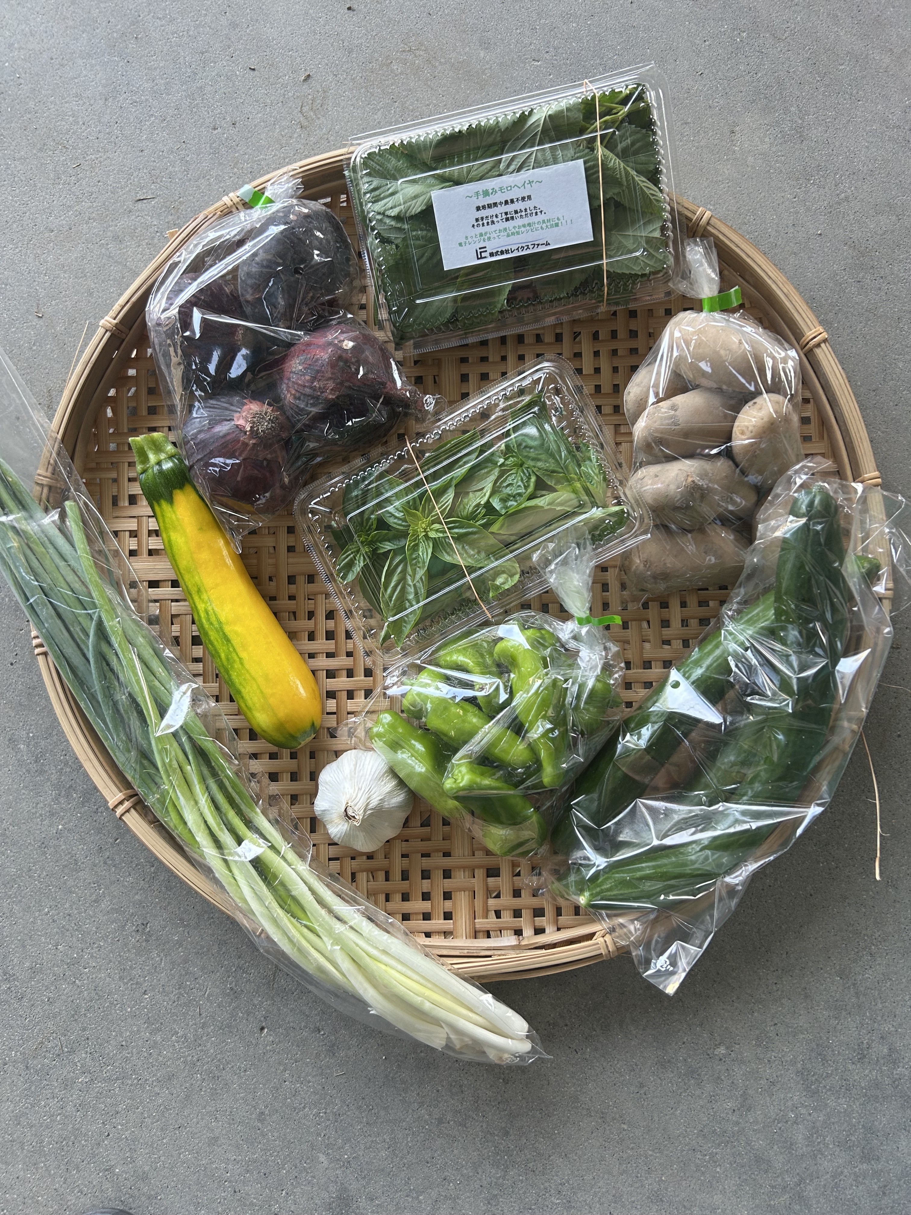 バジル、モロヘイヤ、なす、ズッキーニ、きゅうり、ピーマン、ネギ、赤玉ねぎ、じゃがいも(メークイン)、ニンニク ✙ ミニトマト(写真に入っています)