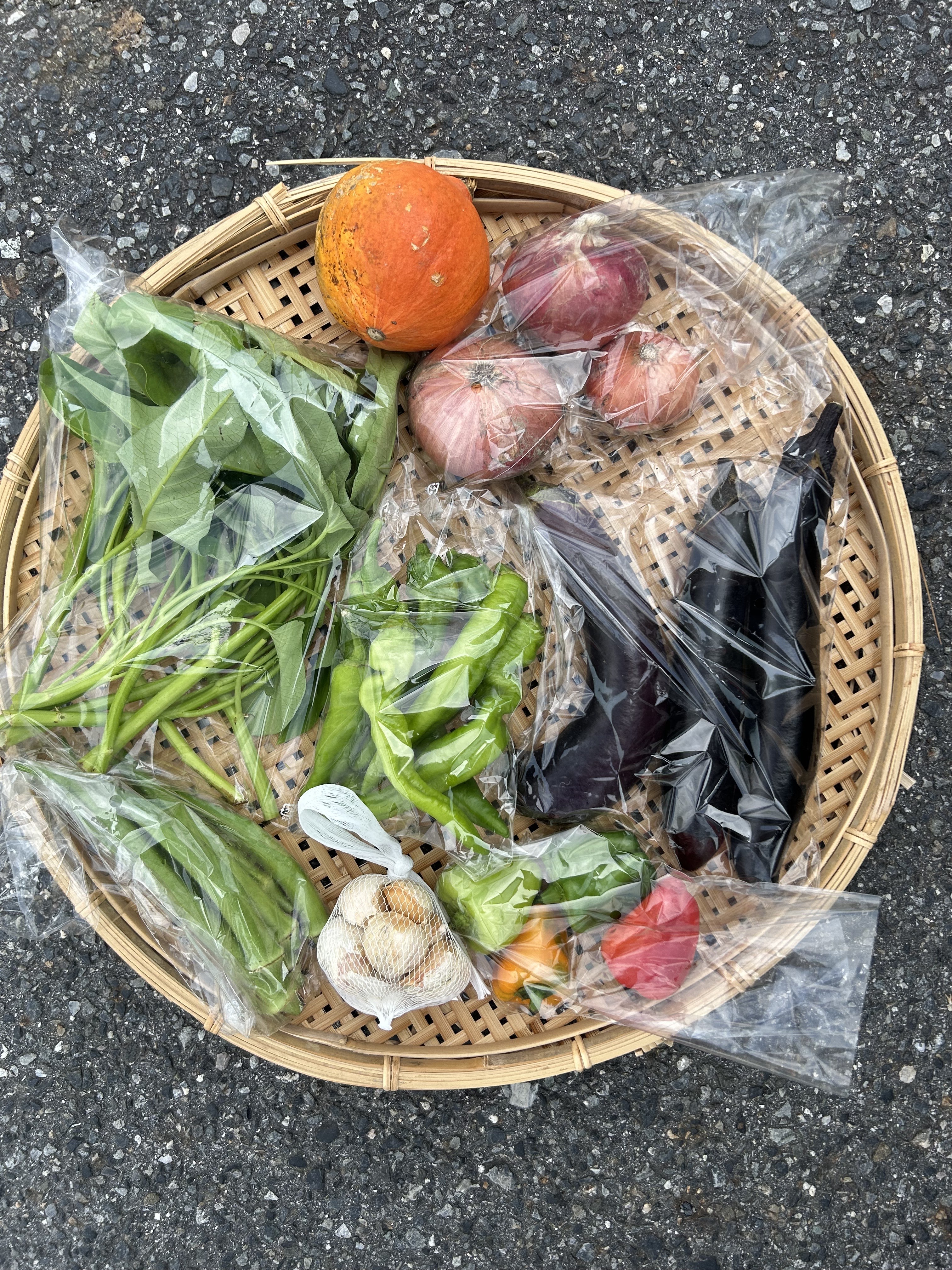 オカワカメ、空芯菜、ミニかぼちゃ、下田ナス、じゃがいも(レッドムーン)、甘長唐辛子