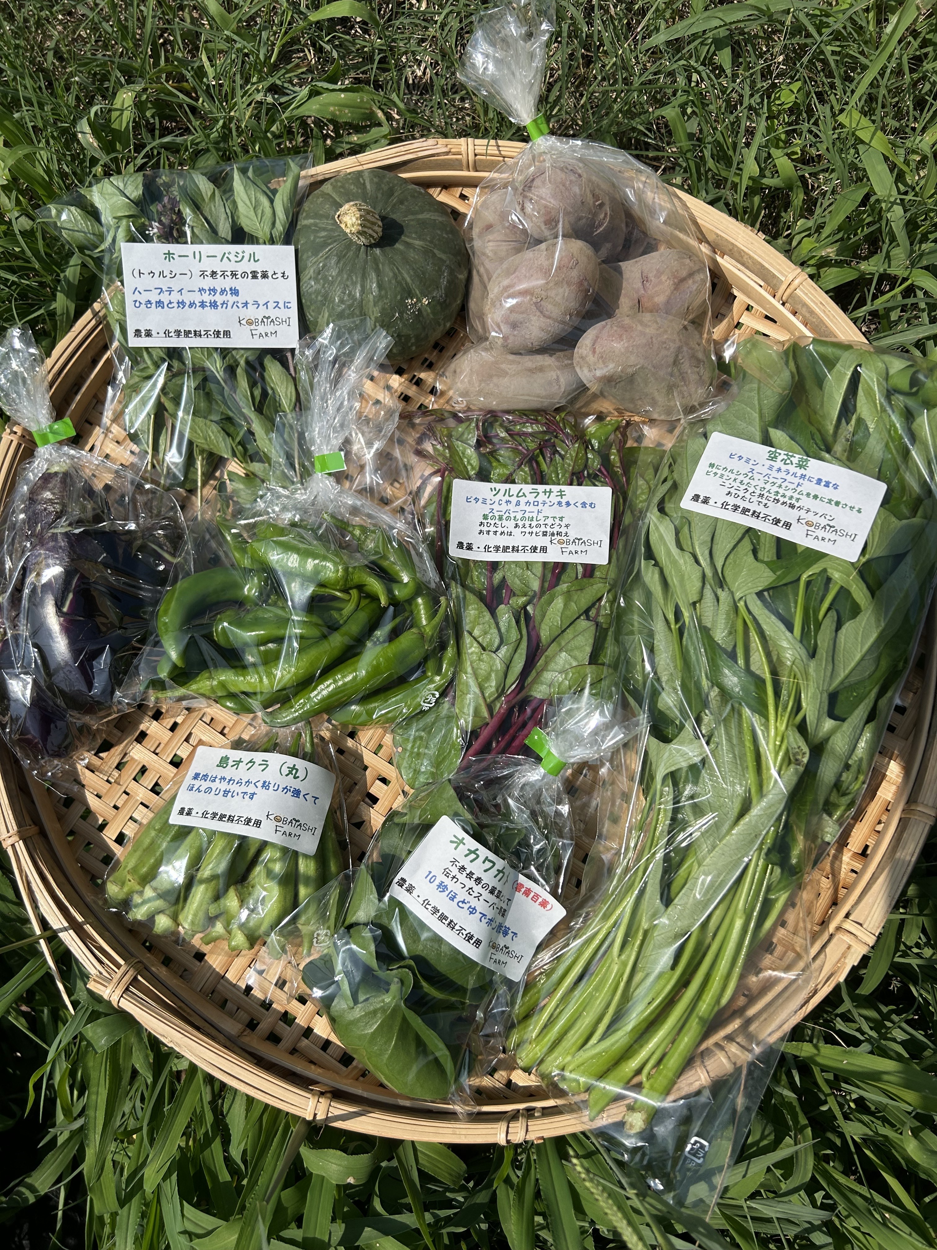 オカワカメ、空芯菜、ミニかぼちゃ、下田ナス、じゃがいも(レッドムーン)、甘長唐辛子、しまオクラ、ホーリーバジル