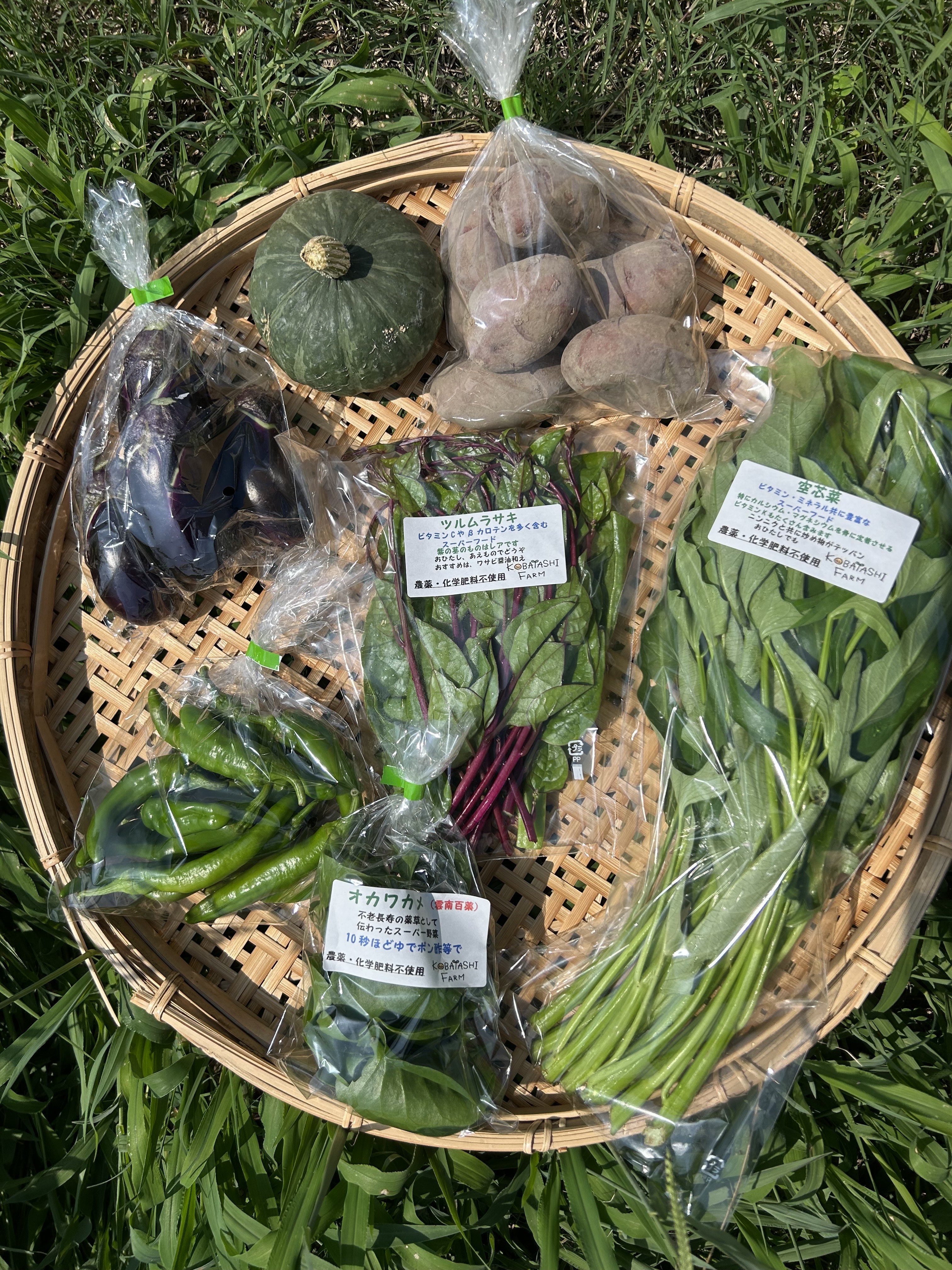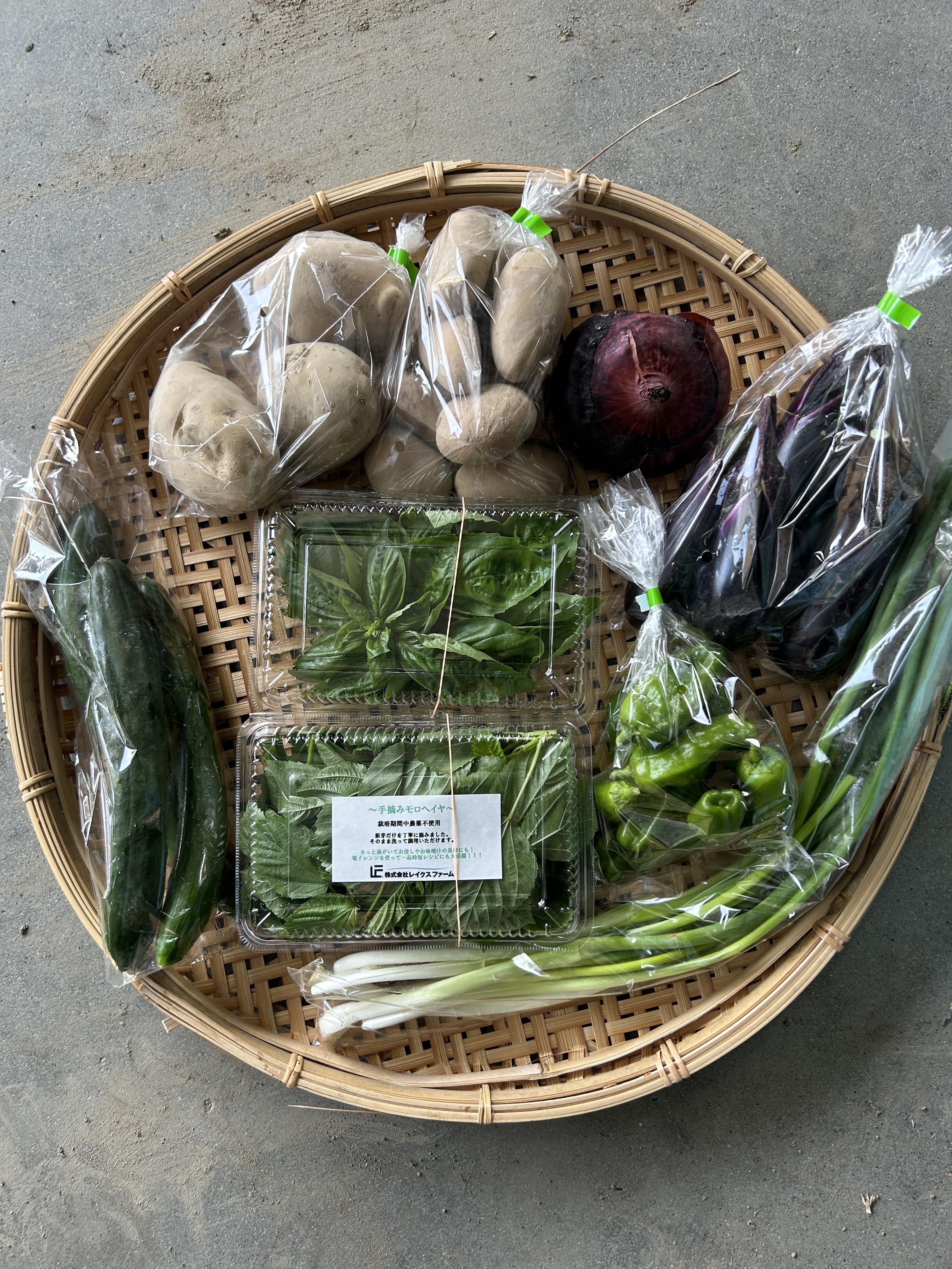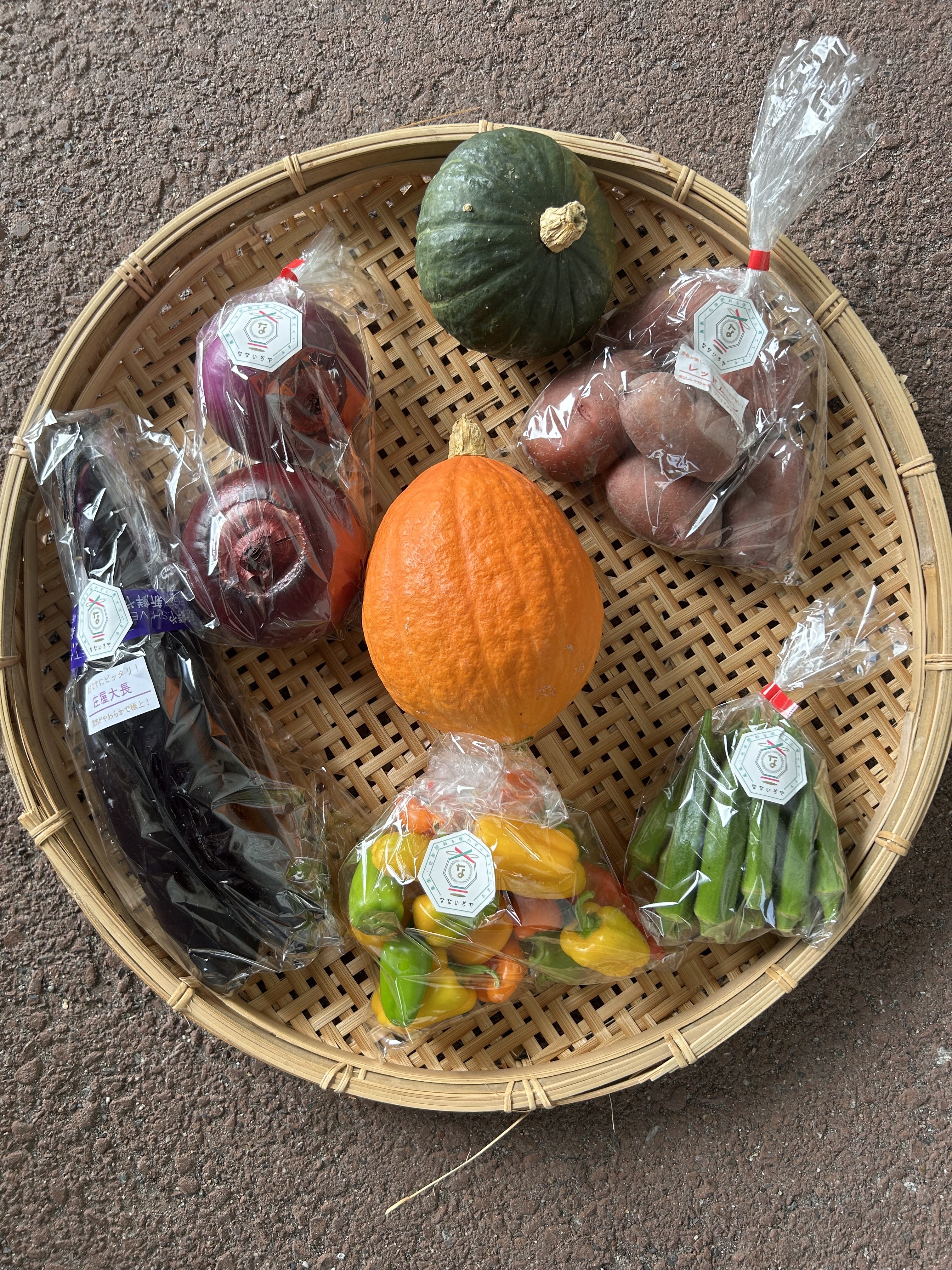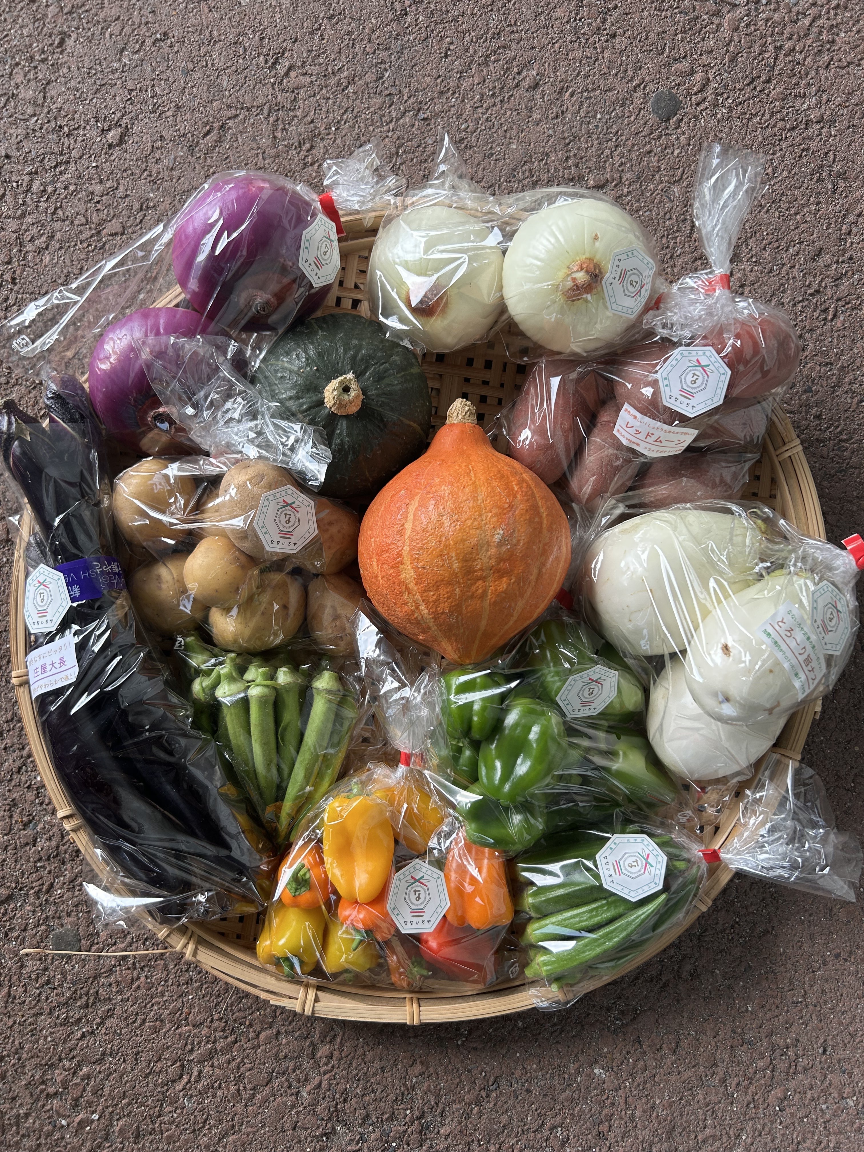 オクラ、丸オクラ(エメラルド)、カラフルピーマン、庄屋大長ナス、じゃがいも(とうや)、コリンキー、ミニかぼちゃ、赤玉ねぎ、新玉ねぎ、じゃがいも(レッドムーン)