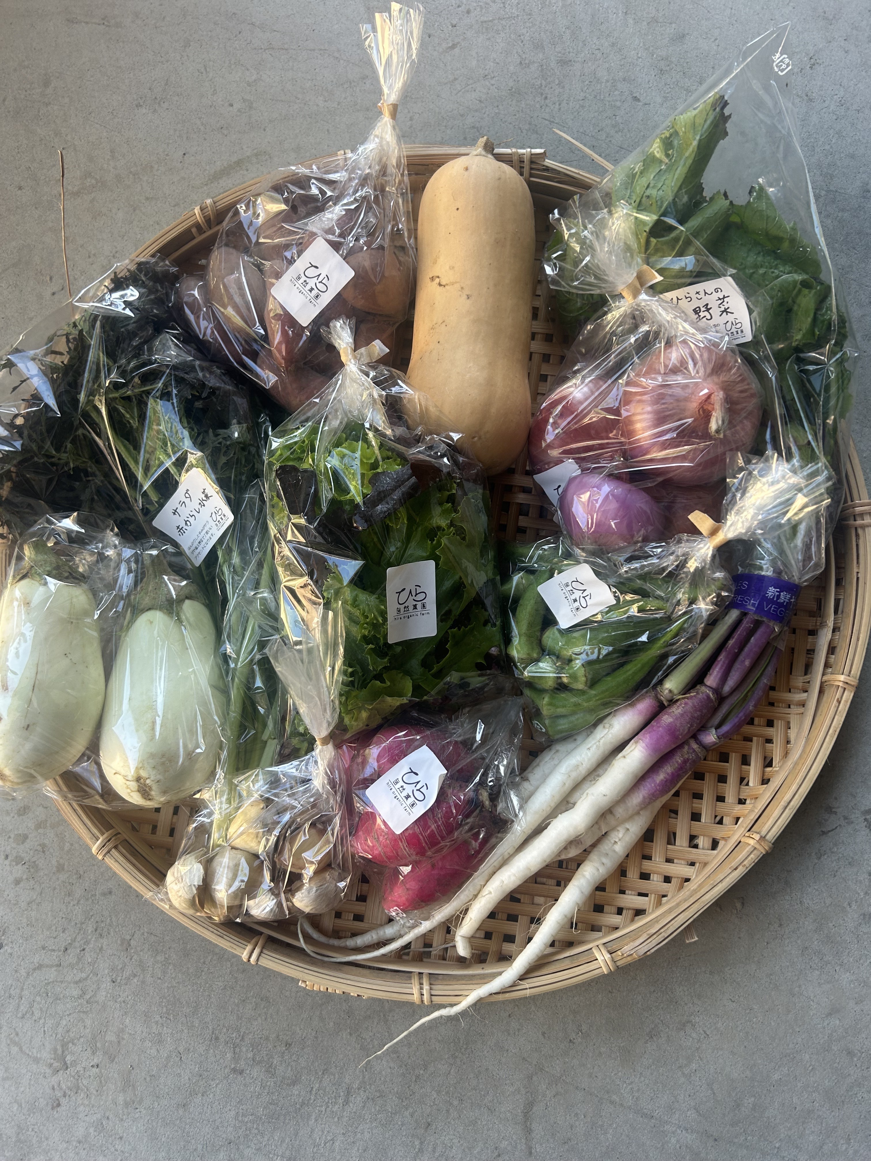 オクラ(エメラルド)、バターナッツかぼちゃ、じゃがいも(シェリー)、大根(紅三太)、サラダ玉ねぎ、とろーり旨ナス、ジャンボニンニク、日野菜、リーフレタス、からし菜