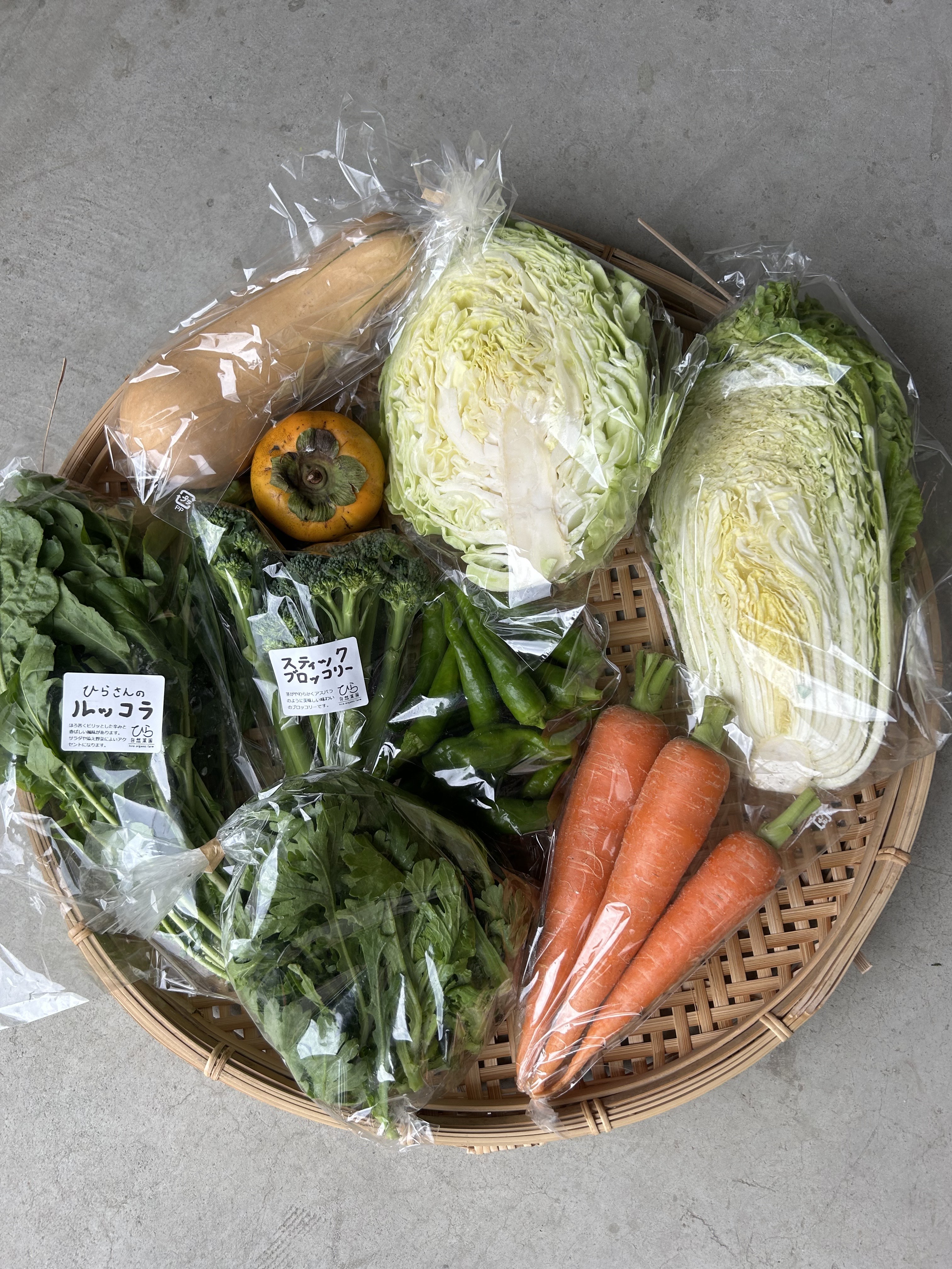 バターナッツかぼちゃ、キャベツ、人参、ミニ白菜、万願寺とうがらし、ブロッコリー、ルッコラ、春菊