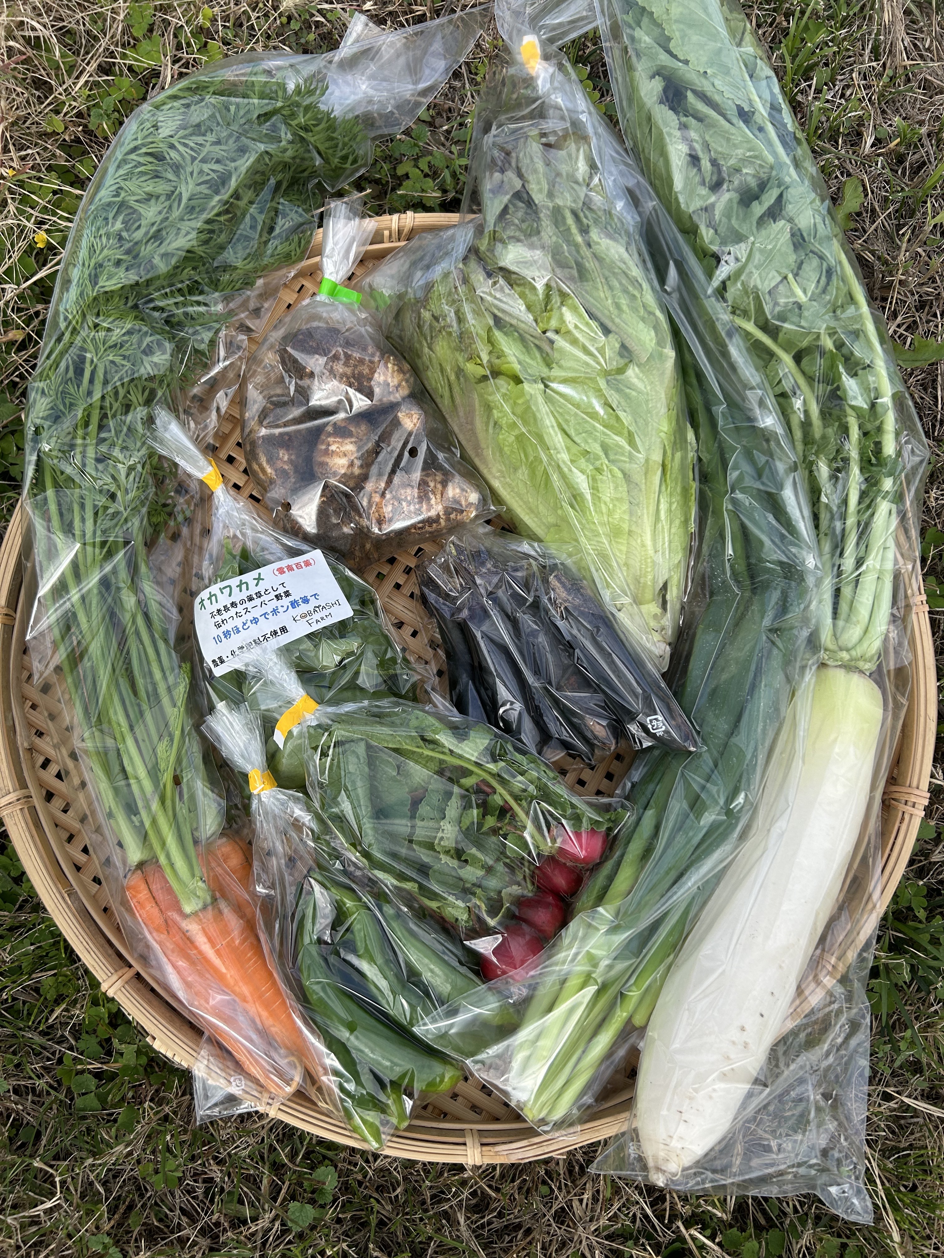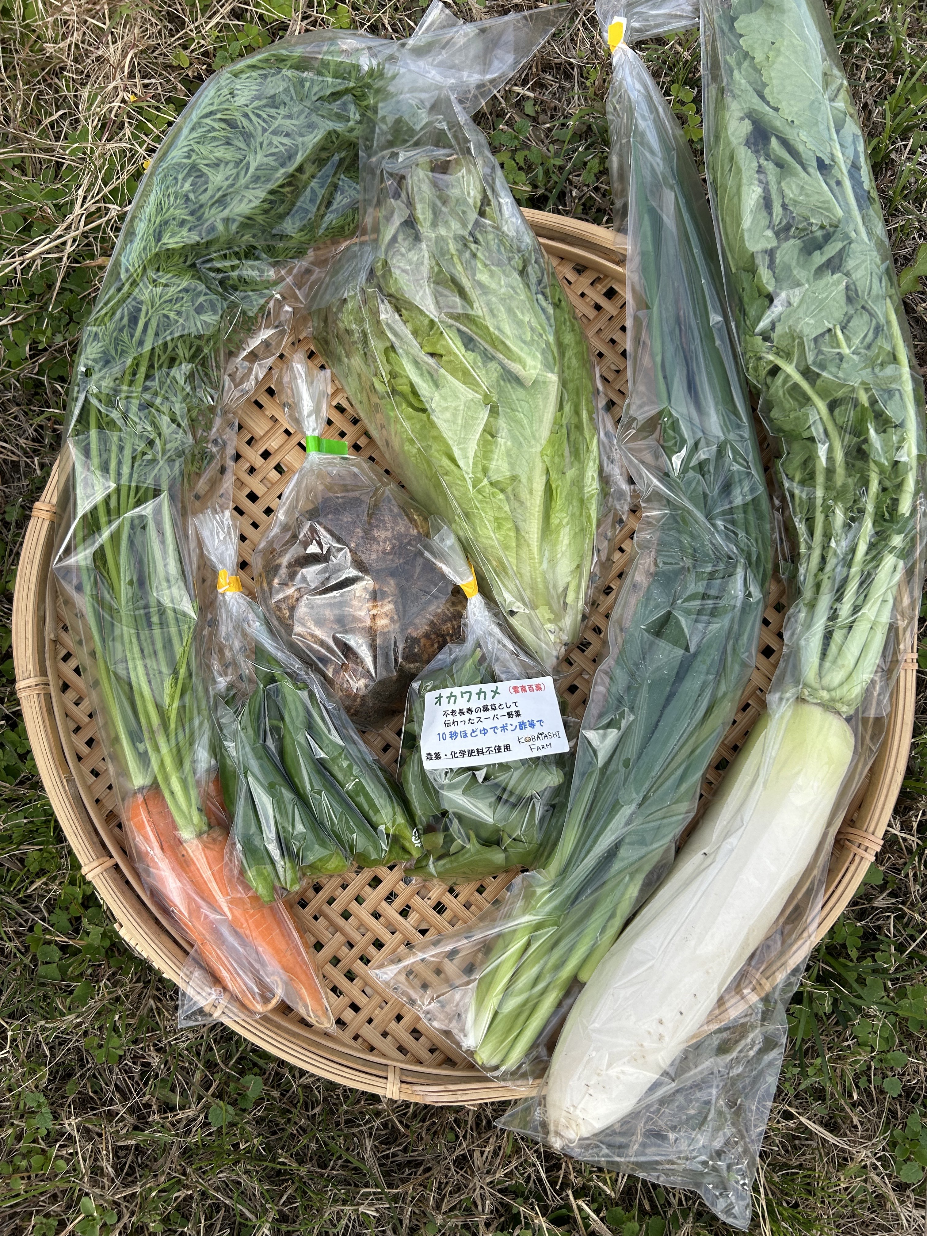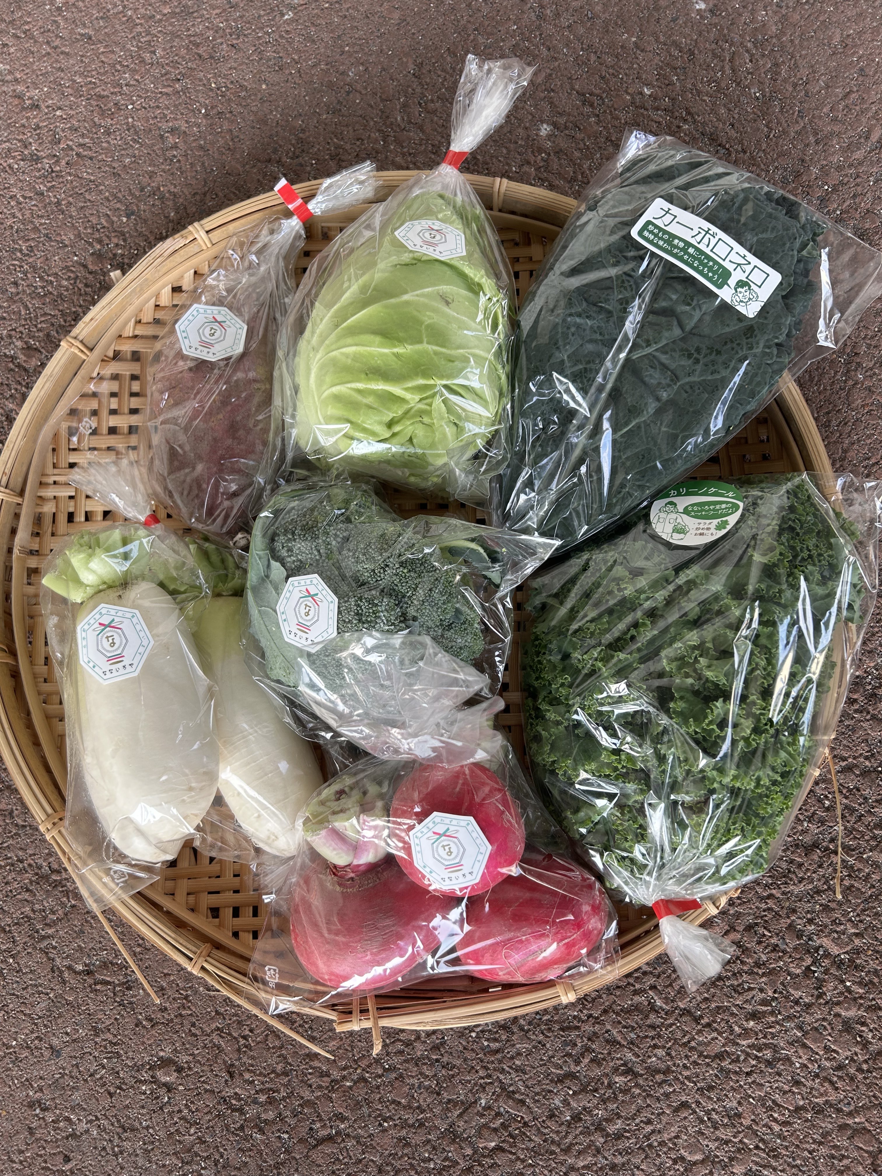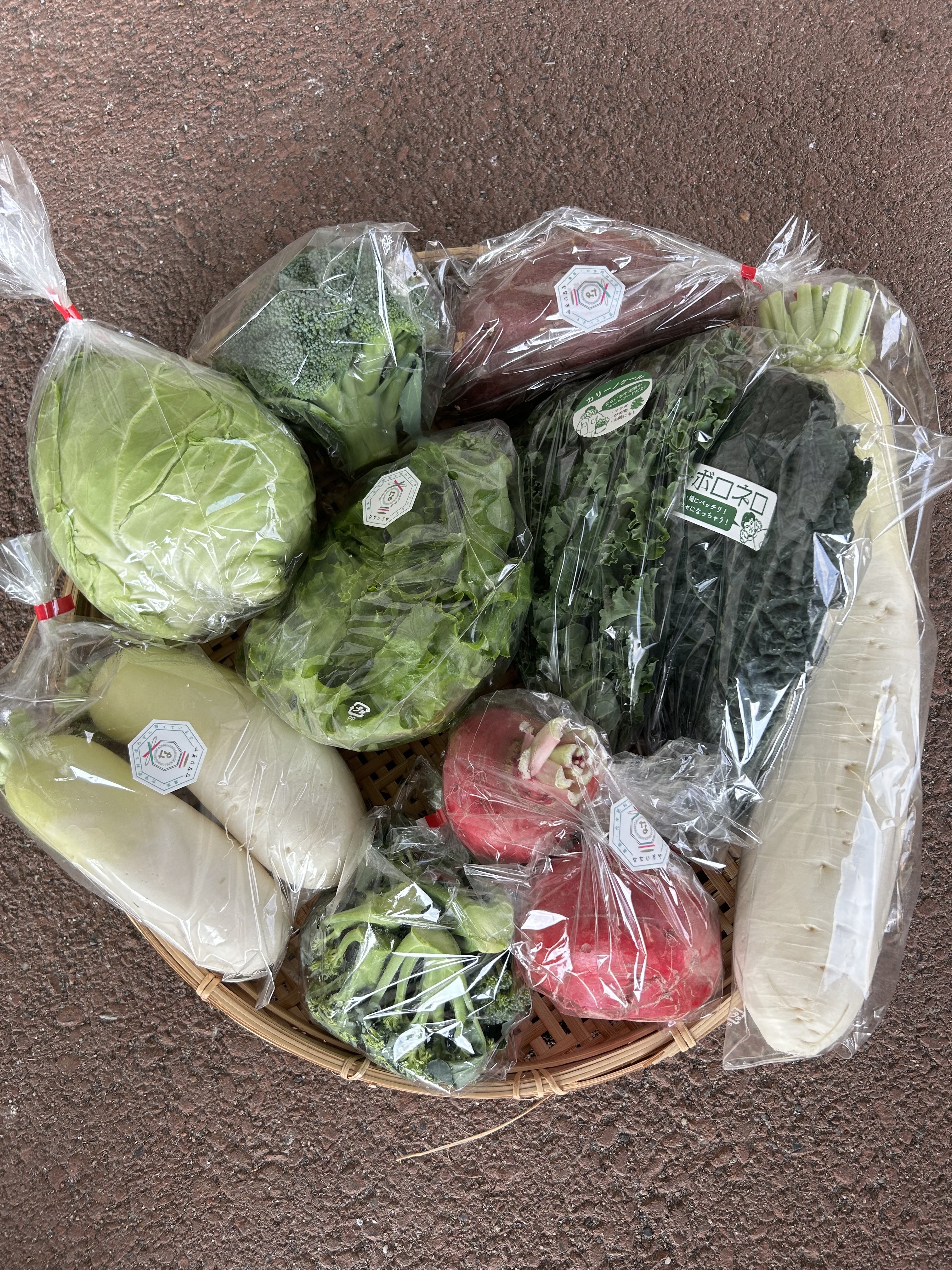 カリーノケール、カーボロネロ、とんがりキャベツ、ブロッコリー、紅てまりカブ、ころっ娘ミニ大根、サツマイモ(シルクスイート)