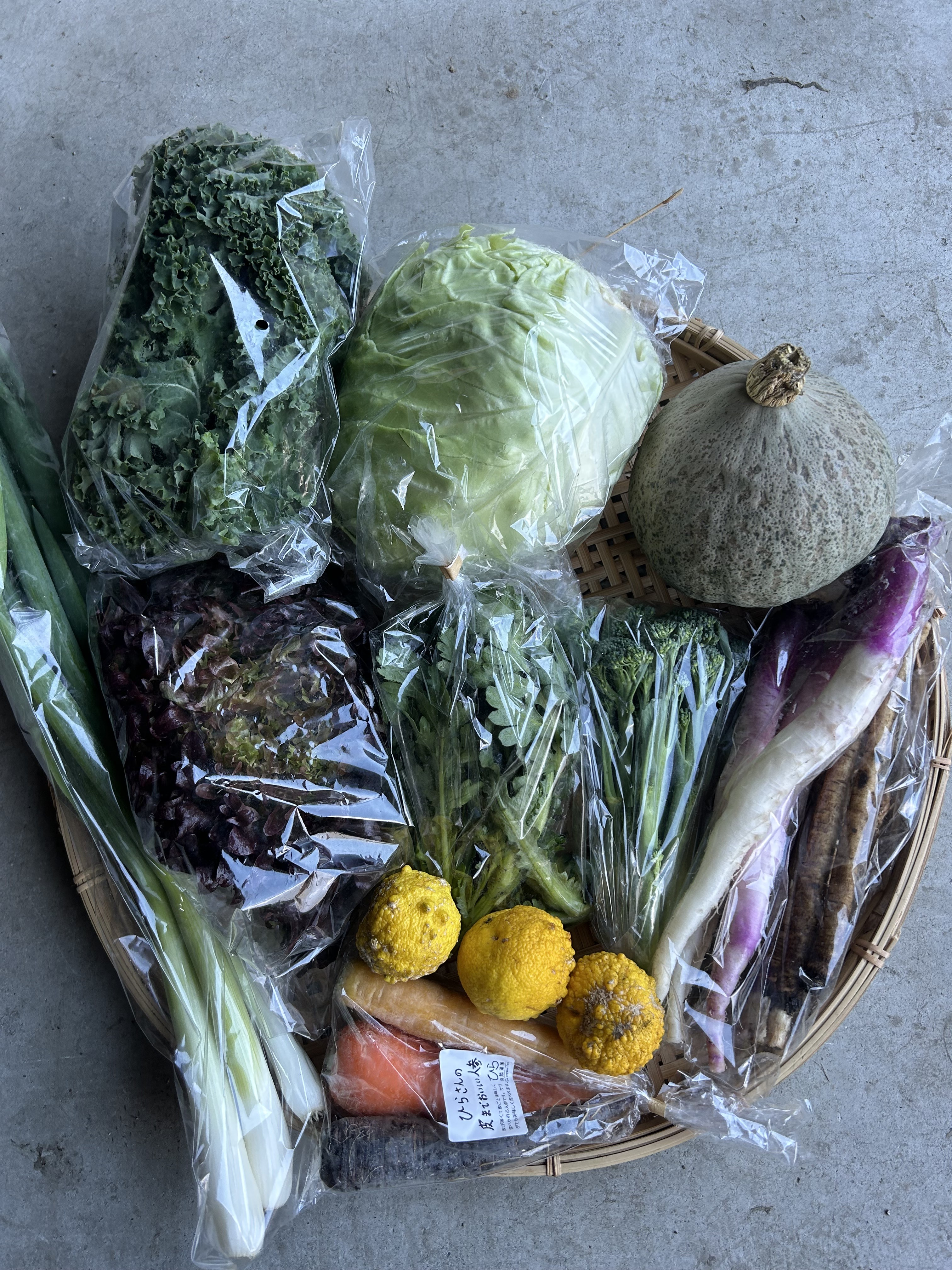 かぼちゃ、キャベツ、カリーノケール、ゴボウ、人参、ねぎ、日野菜、ブロッコリー、リーフレタス、春菊