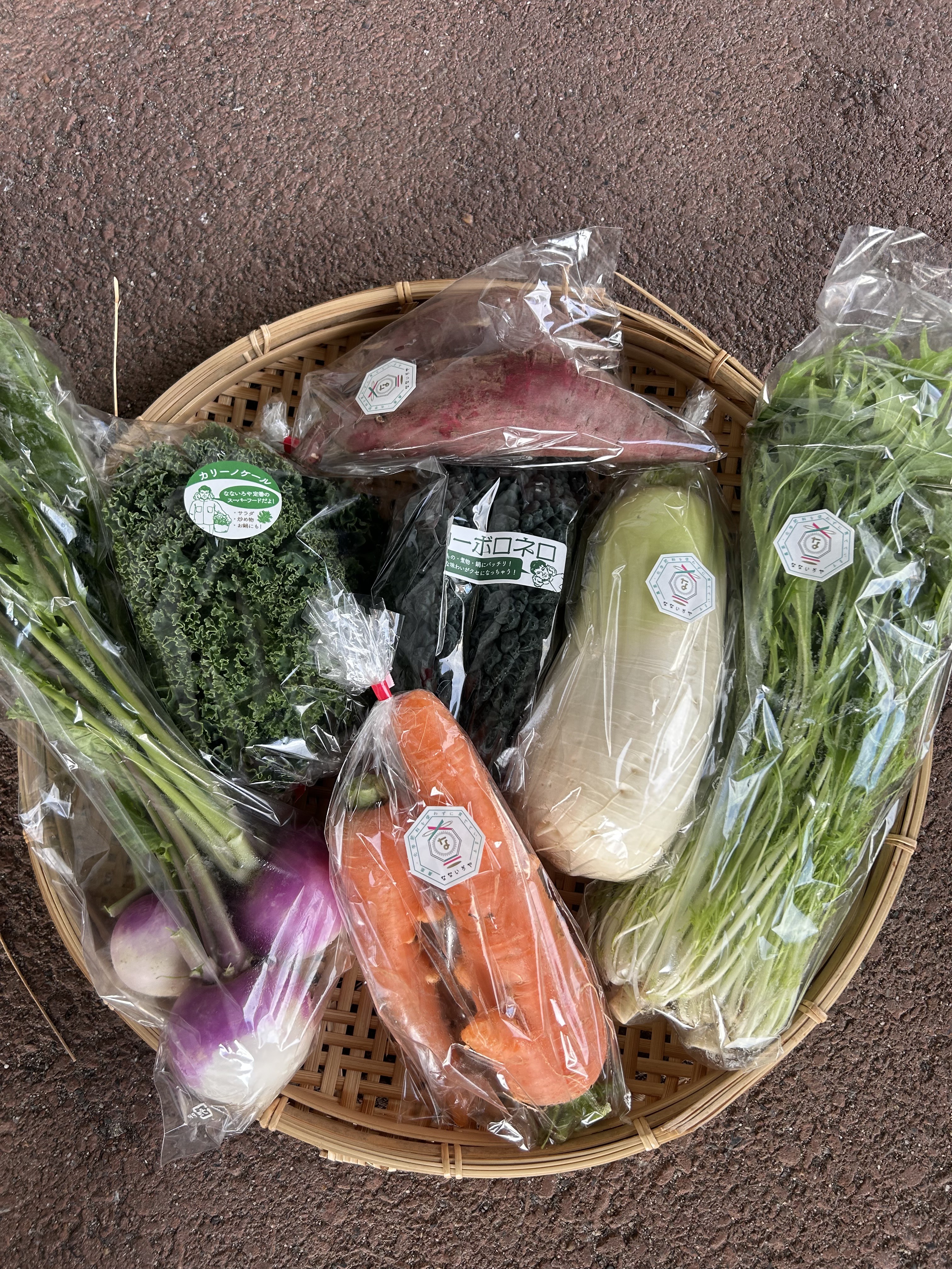カリーノケール、カーボロネロ、フレアルージュ、水菜、茎ブロッコリー、人参、あやめ雪カブ、おでん大根、ミニ大根、サツマイモ(シルクスイート)
