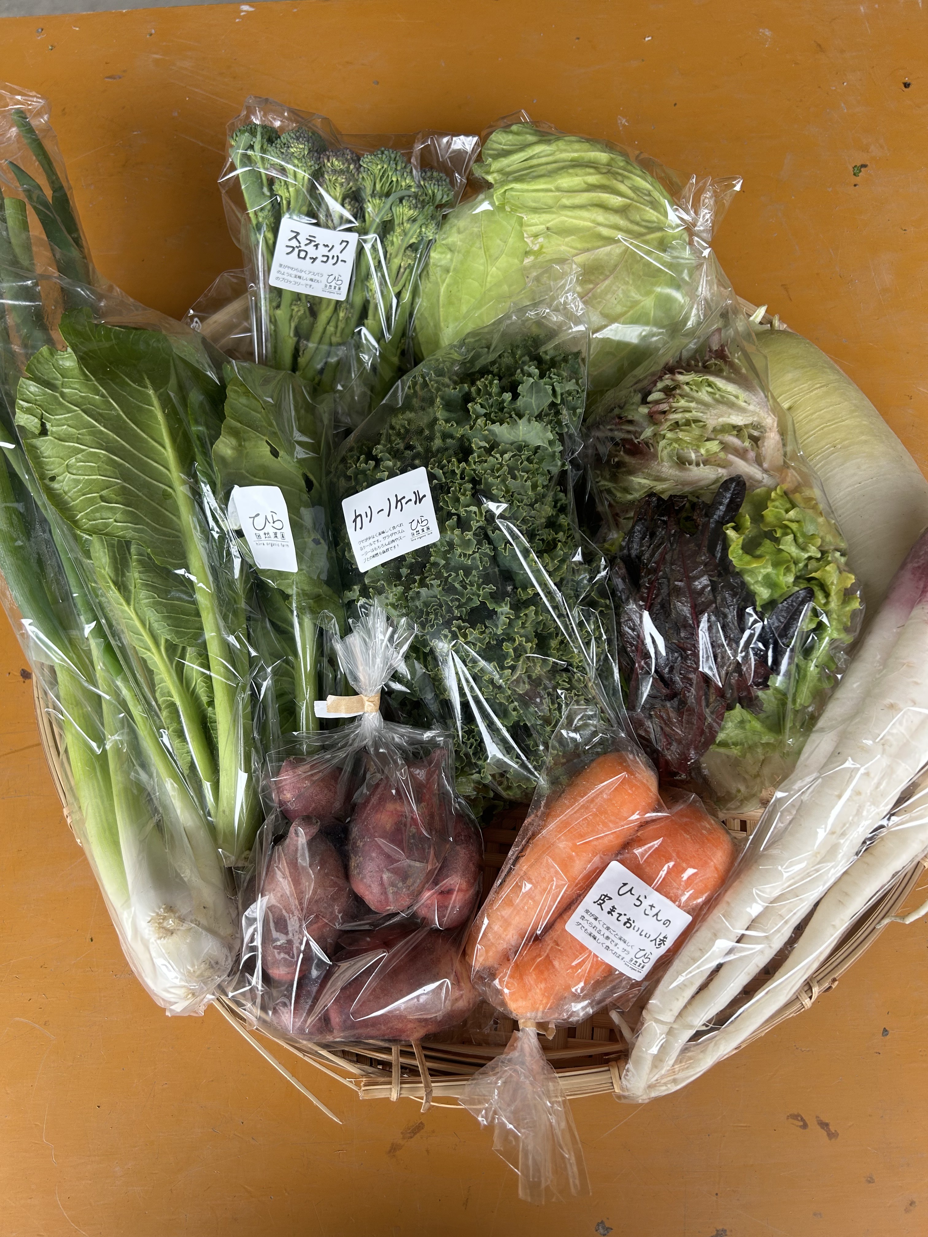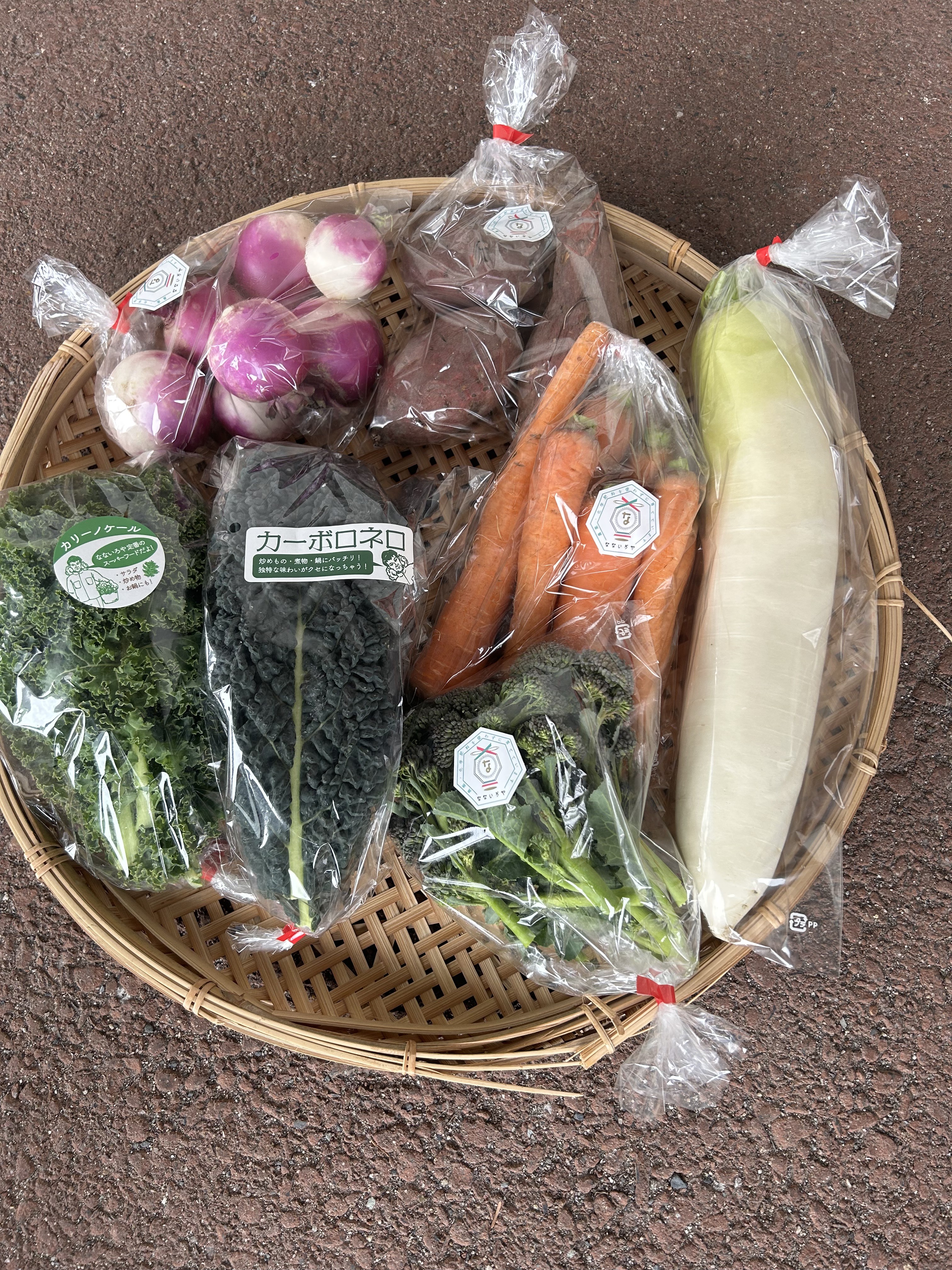 カリーノケール、カーボロネロ、茎ブロッコリー、人参、赤水菜、キャベツ、あやめ雪カブ、おでん大根、サツマイモ(シルクスイート)、じゃがいも(レッドムーン)