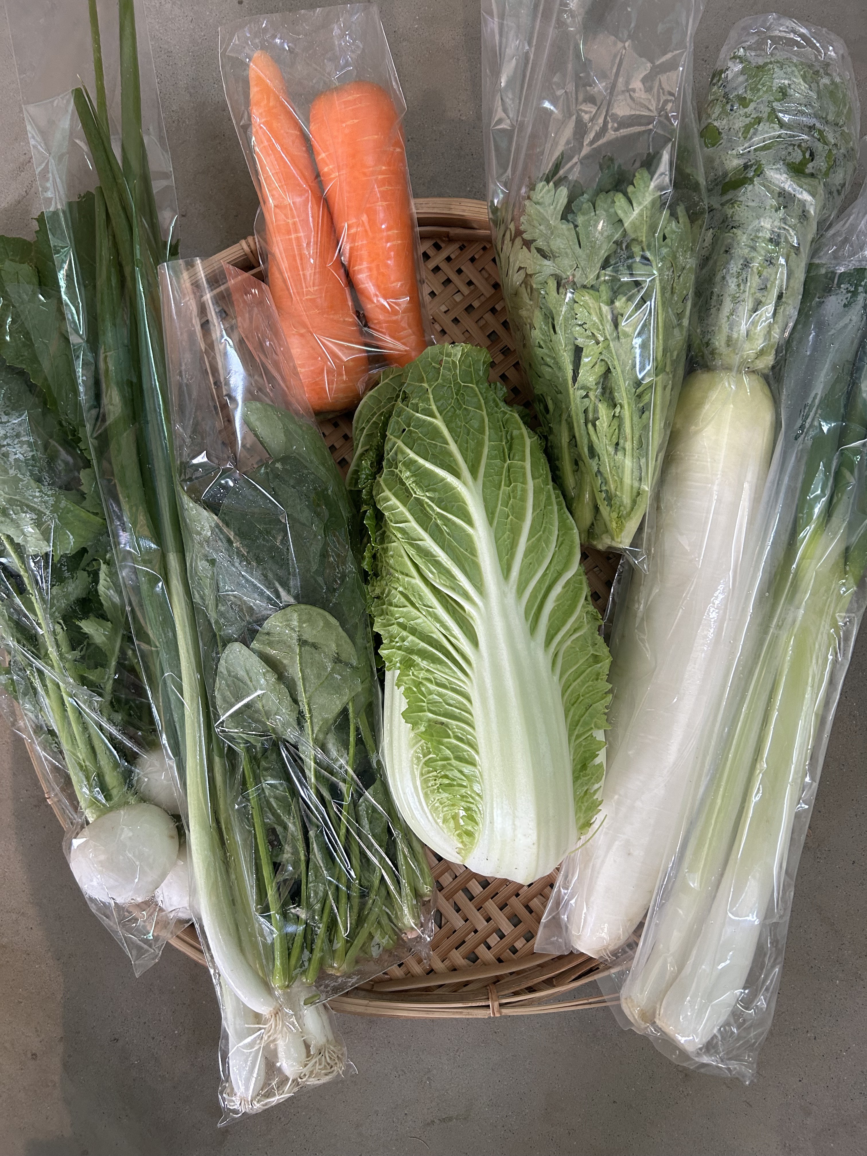 ほうれん草、春菊、こかぶ、太ねぎ、大根、白菜、人参、細ねぎ