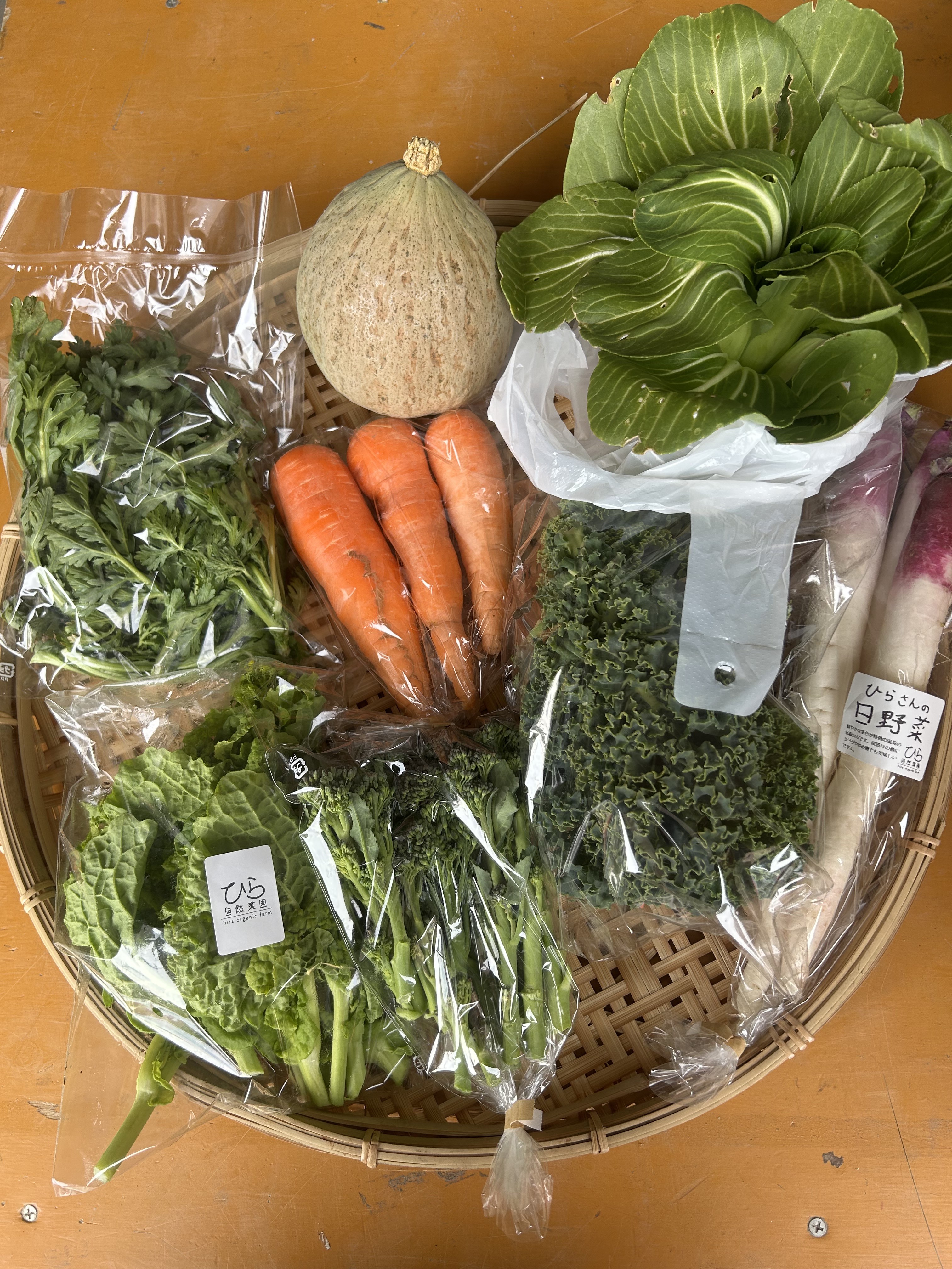 カボチャ、カリーノケール、人参、日野菜、ブロッコリー、春菊、なばな、ミニ青梗菜