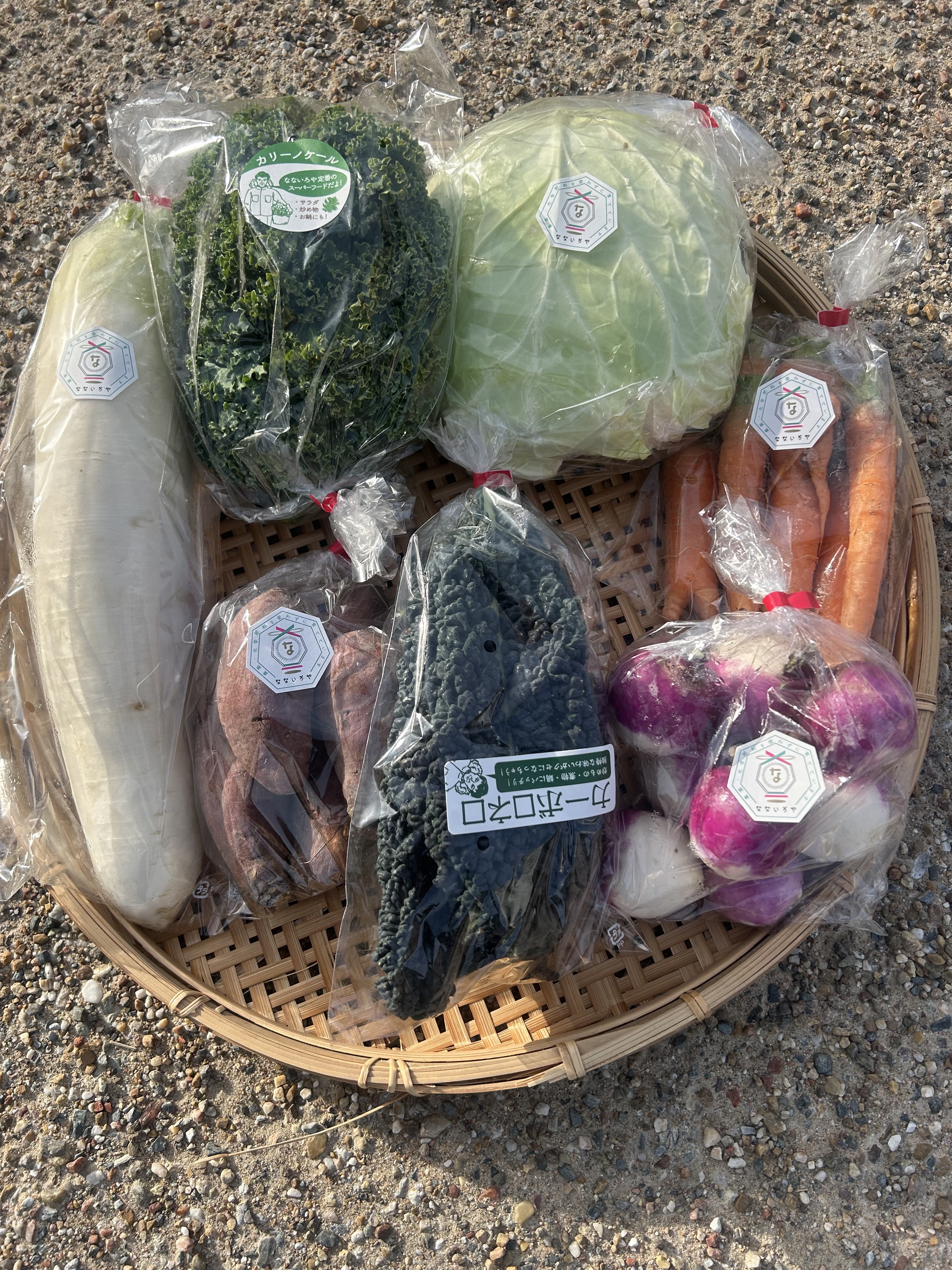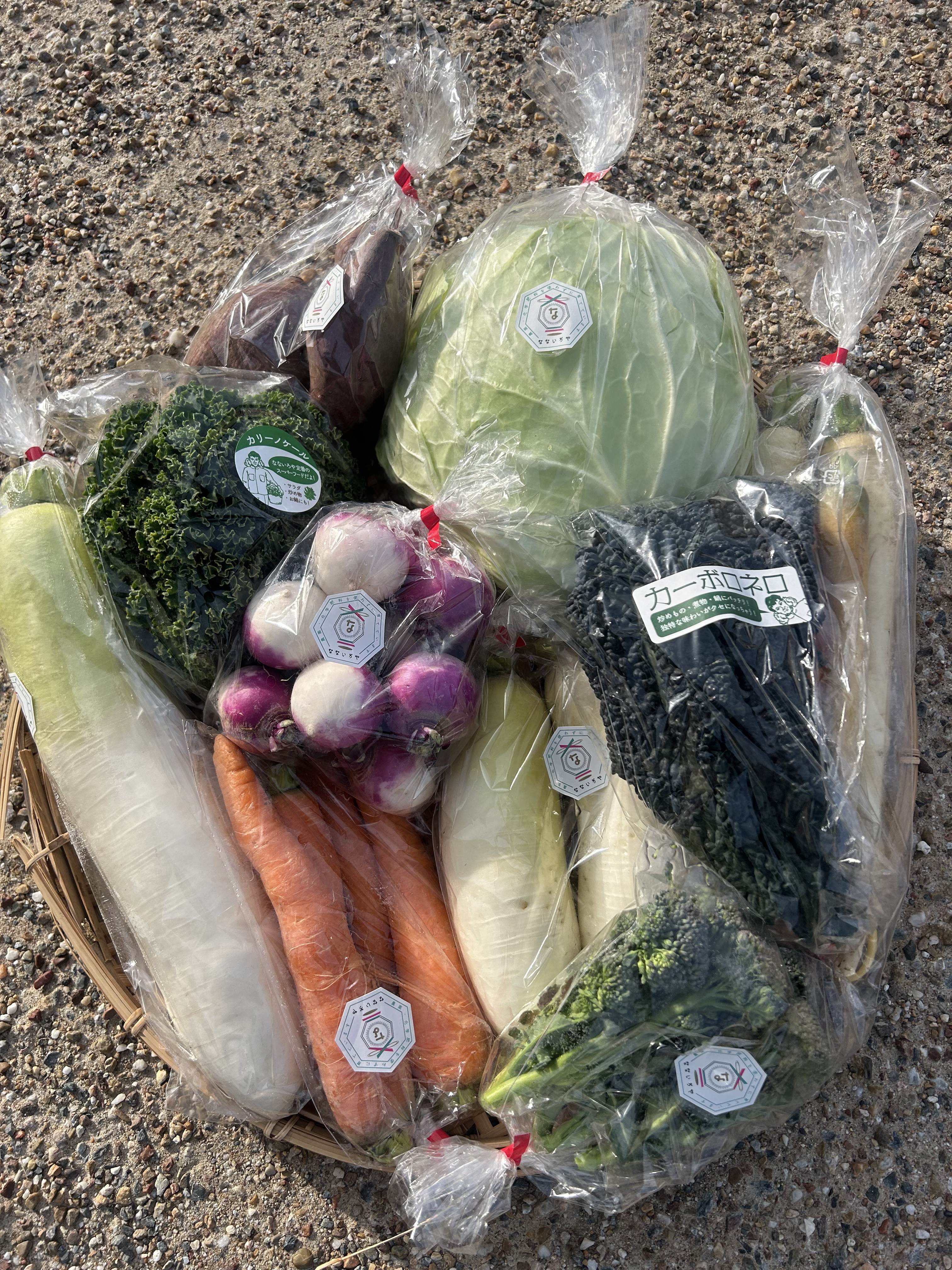 カリーノケール、カーボロネロ、茎ブロッコリー、あやめ雪カブ、おでん大根、人参、カラー人参、キャベツ、ミニ大根、サツマイモ(シルクスイート)