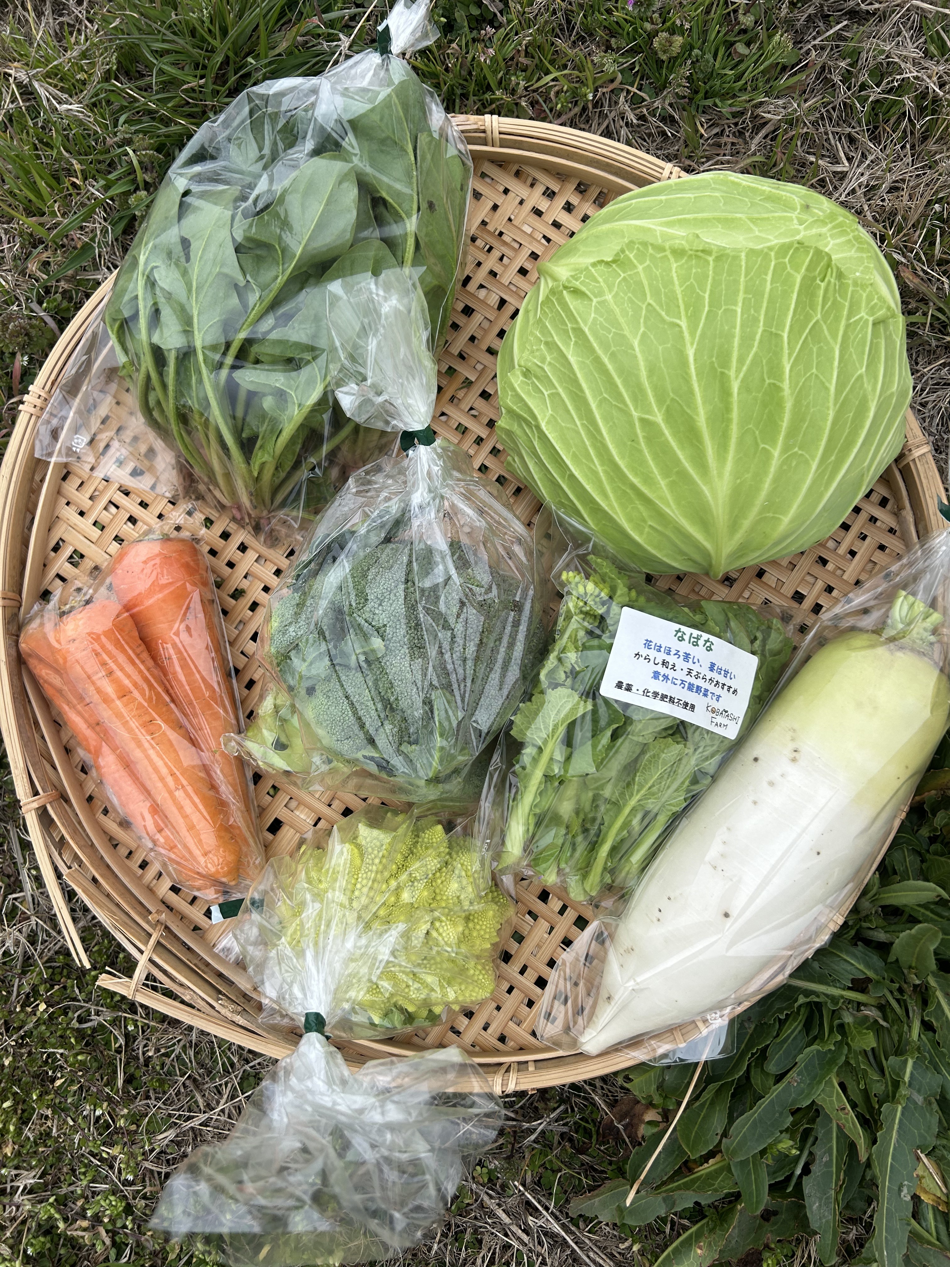 キャベツ、大根、人参、サラダかぶ、ほうれん草、ブロッコリー、ロマネスコ、なばな、ビタミン大根、かつお菜