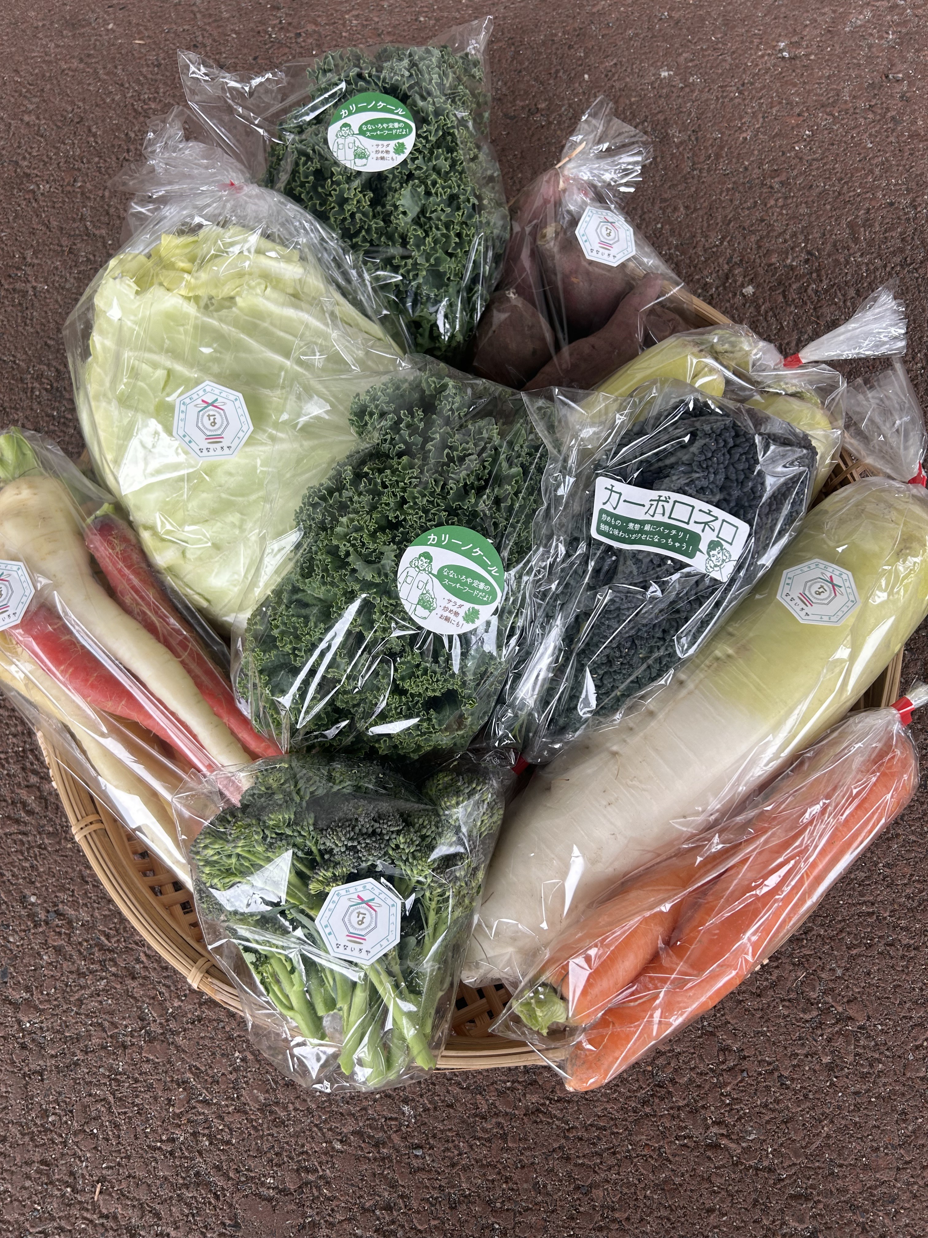 カリーノケール、カーボロネロ、茎ブロッコリー、キャベツ、人参、カラー人参、おでん大根、ミニ大根、サツマイモ(シルクスイート)